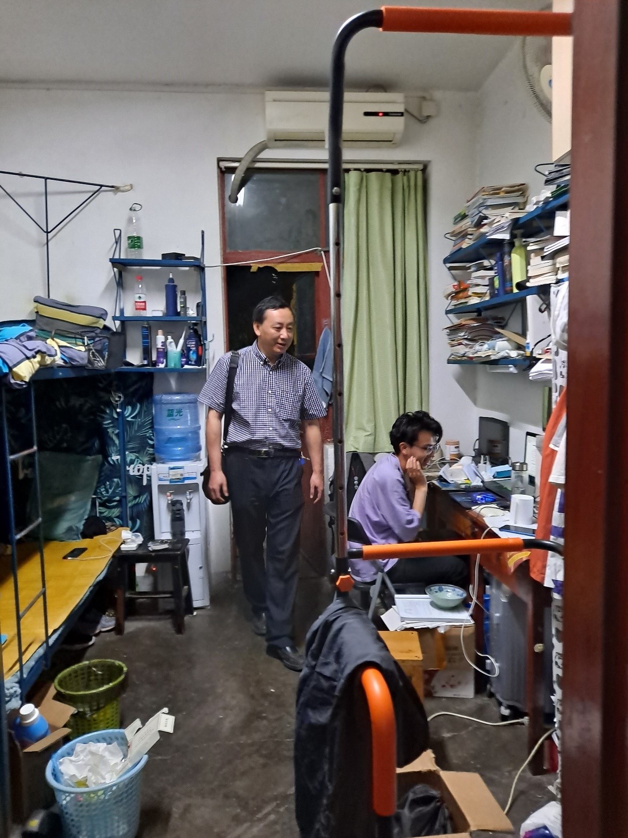 随后张书记一行来到五楼毕业生宿舍,就升学、就业和毕业论文进展等同毕业生们亲切交谈,同时叮嘱同学们在五一劳动节期间注意人身和财产安全,特别是宿舍用电安全并祝大家节日快乐!