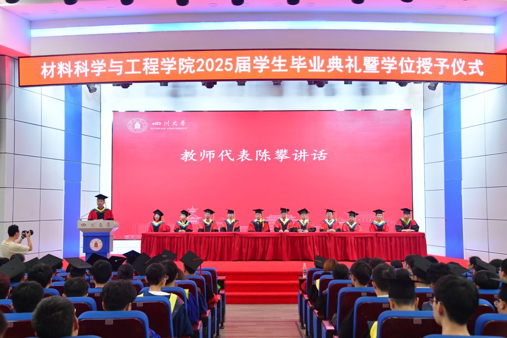首先由院长刘颖致辞,他寄语毕业生们,时光荏苒,同学们的成长画卷在川大徐徐展开,也即将迎来扬帆远航。刘颖院长送给同学们三句话:胸怀国之大者,永保赤诚之心;矢志创新奋斗,勇攀科技高峰;身怀感恩之心,砥砺高尚品格。最终祝愿同学们知行合一、德才并进,胸怀材料报国的理想,以梦为马不负韶华。