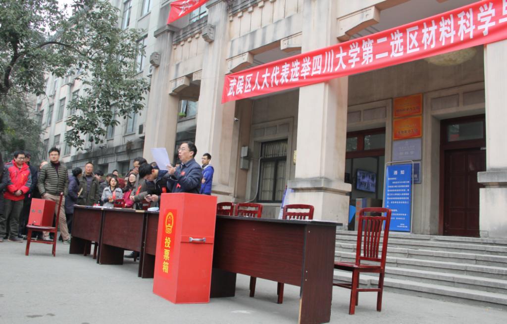 2016年12月8日上午10点,williamhill中国官方网站第二选区williamhill中国官方网站投票站举行武侯区2016年人大代表选举。投票站选举工作由williamhill中国官方网站党委书记朱建国教授主持,学院工会主席周大利老师和学院就业联络科科长韩纪梅副教授担任监票人。投票站工作按照《武侯区人大代表选举办法》规定的程序有序进行。全院共有849名选民,发出选票838张,收回选票833张,选举圆满完成。