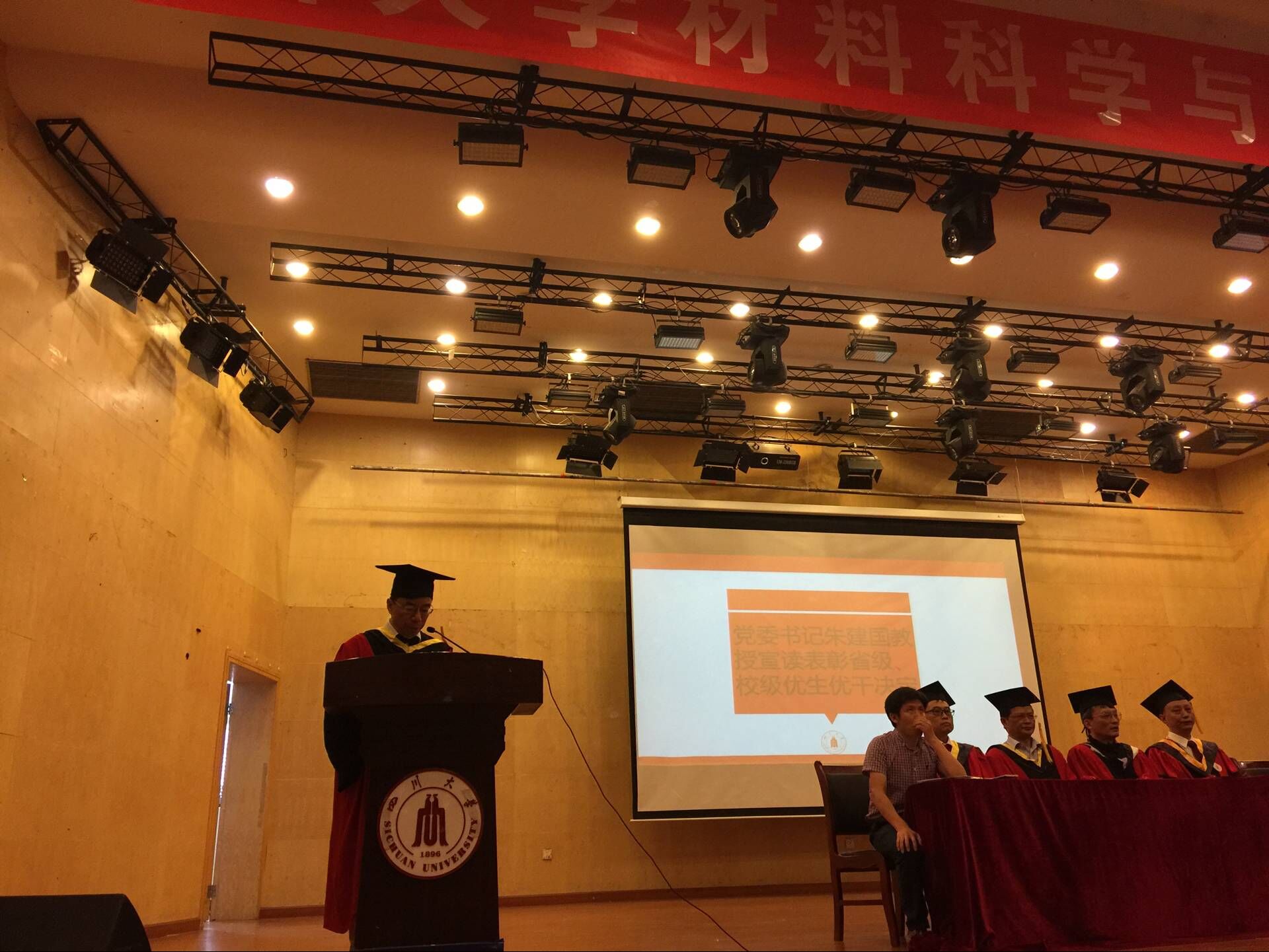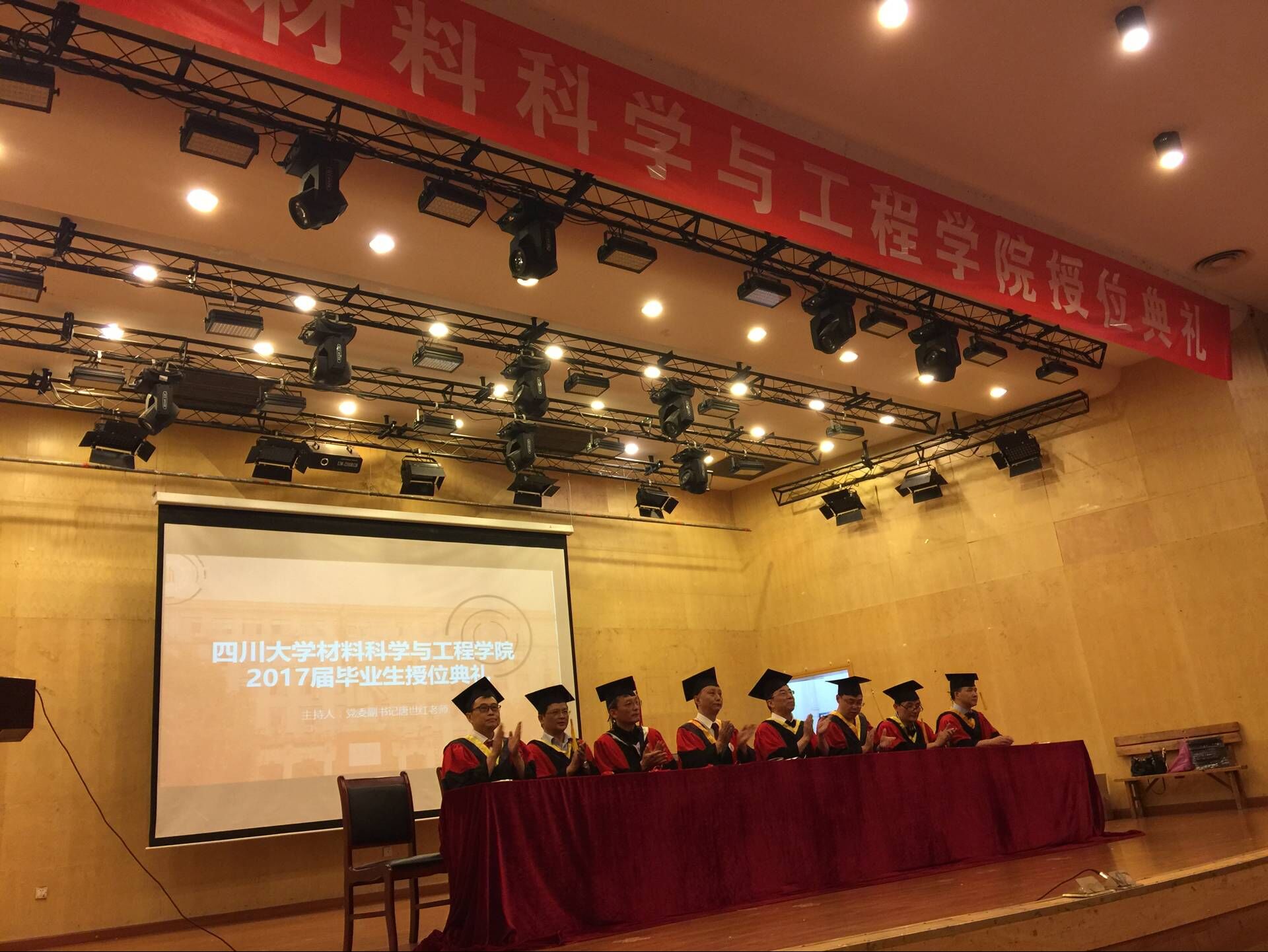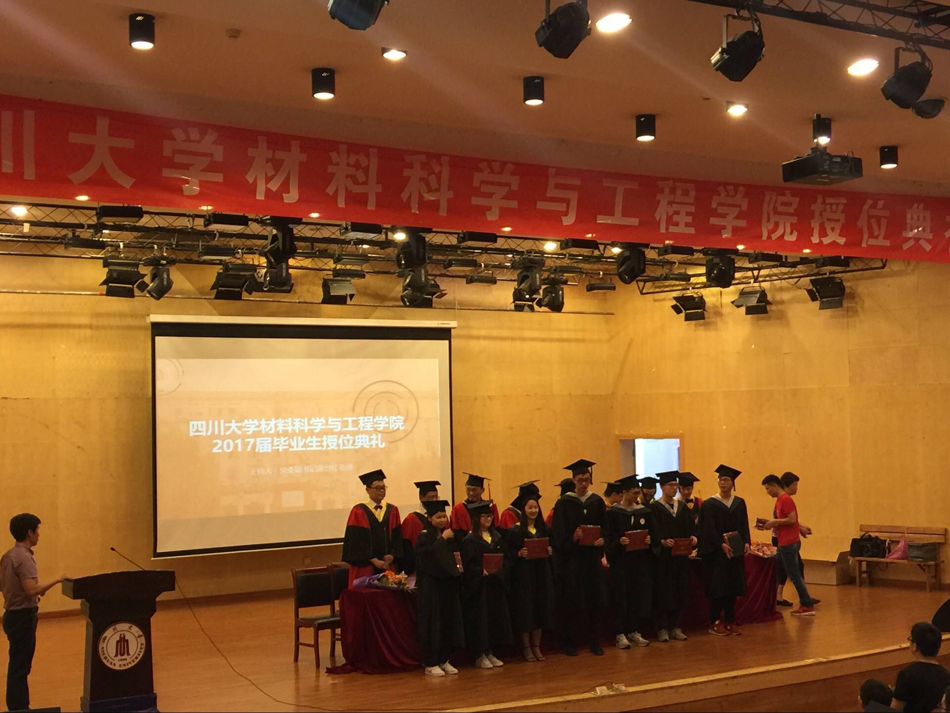 2017年6月12日上午8:20,在文华活动中心二楼音乐演播厅举行了2017届williamhill中国官方网站毕业典礼。williamhill中国官方网站院长尹光福教授、党委书记朱建国教授、副院长刘颖教授、工会主席周大利教授、副院长孙小松教授、党委副书记唐世红老师、新能源系主任陈云贵教授、材料科学系主任张静全教授、无机生医系党支部书记黄忠兵教授等诸位领导、老师,2017届博士、硕士以及学士共356名毕业生齐聚一堂。典礼由williamhill中国官方网站党委副书记唐世红老师主持。院长尹光福教授发表了满怀深意的讲话,向所有毕业生表达了殷切的期望和浓浓的祝福。党委书记朱建国教授宣读了2017届省级校级优秀毕业生优秀学生干部的表彰决定,向2017届的优秀毕业生们表示了真挚的祝贺。教师代表张静全教授代表全体教职工向材料学院全体毕业生表达了深切的祝愿。随后2013级本科毕业生王倩同学代表全体毕业生发表了主旨为“知识与担当”的演讲。最后是毕业典礼授位仪式,老师们将毕业证书和学位证书一一交到同学们手中,并对同学们表示祝贺。2017届毕业典礼在同学们的高兴与不舍中落下了帷幕。