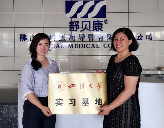 图3.带队老师向佛山导管公司授于“williamhill中国官方网站实习基地”铜牌,以感谢该公司对我们川大生物医学工程专业实践活动的一贯支持和帮助。