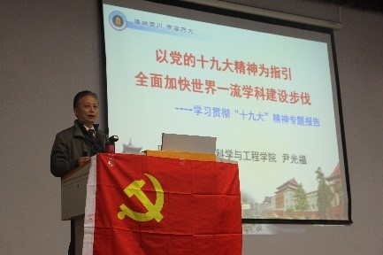为深入学习贯彻党的十九大精神,加快我院世界一流学科建设步伐,12月1日下午2:00,我院党委书记尹光福同志在东三教演播厅讲授了“以党的十九大精神为指引全面加快世界一流学科建设步伐”为主题的专题党课。唐世红同志主持本次会议,全院学生党员同志参加了本次党课的学习。