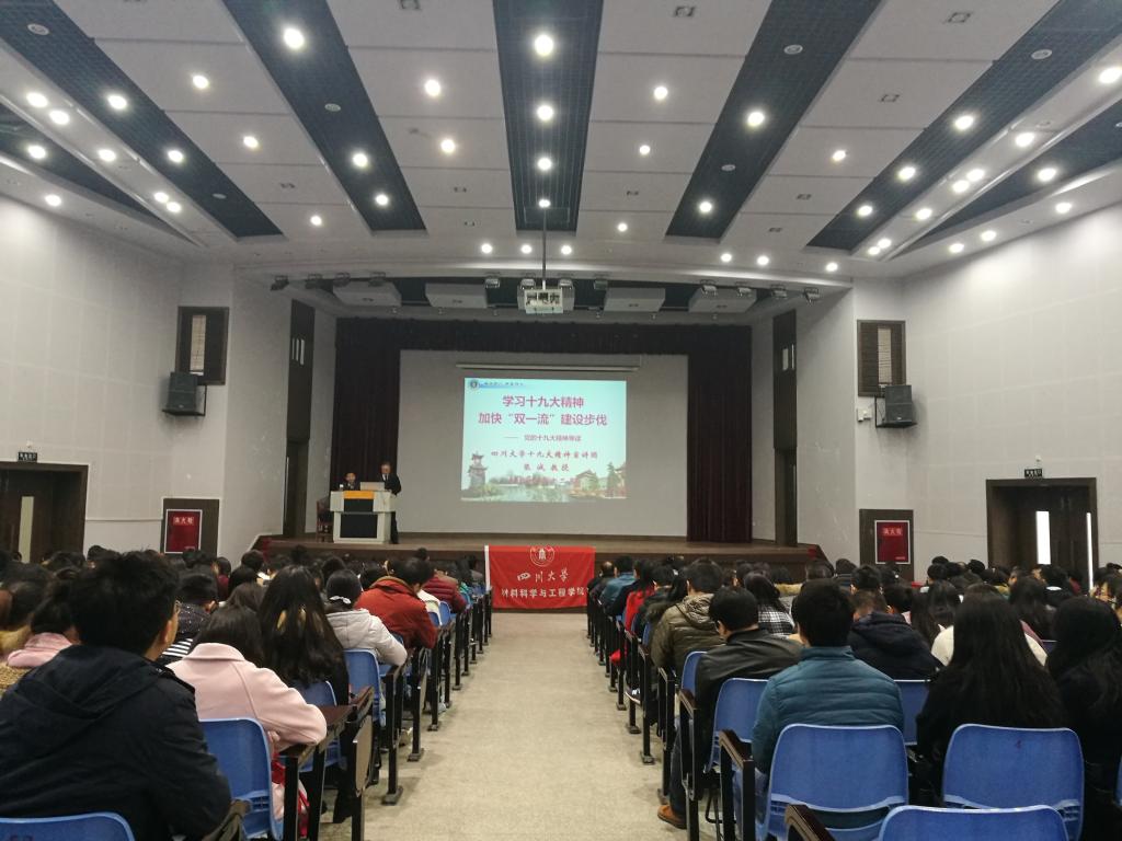 2017年12月11日下午,williamhill中国官方网站,William希尔官网入口在望江校区东三教演播厅举行党的十九大精神宣讲报告会,特邀学校宣讲团成员张诚教授主讲,学院党委书记尹光福教授主持,学院党政领导班子成员、全体党员及师生职工300余人参加了会议。