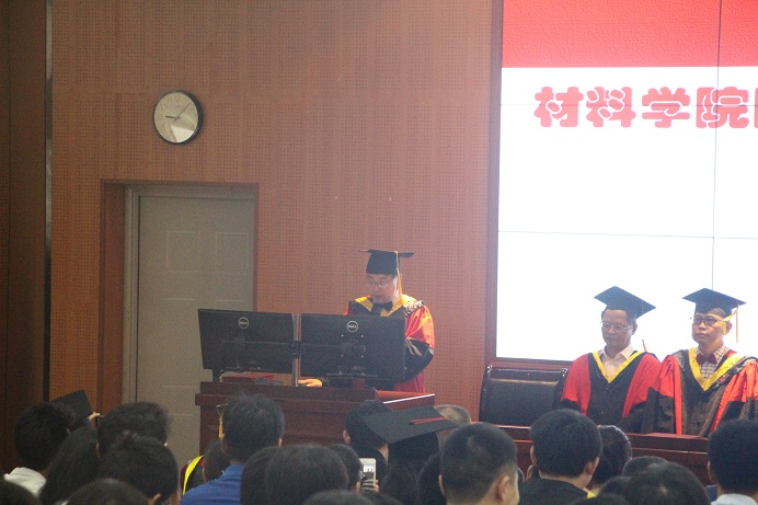 典礼仪式在庄严的国歌声中拉开序幕,首先刘颖院长发表了热情洋溢的致辞,对圆满完成各项课程,取得学历学位的2018届毕业生,表示了热烈的祝贺;对于无私奉献的学院老师以及关心关爱材料学院学生的家长,表示了诚挚的感谢与敬意。而后,刘颖院长希望同学们在今后的工作与学习中,始终保持正确的理念与方向,始终保持积极的人生态度、心怀感恩,勇敢担当社会和家庭的责任,以责任为重、以诚信为本,做一个无愧于自己、无愧于社会的材料学子,为实现中国梦而努力奋斗。