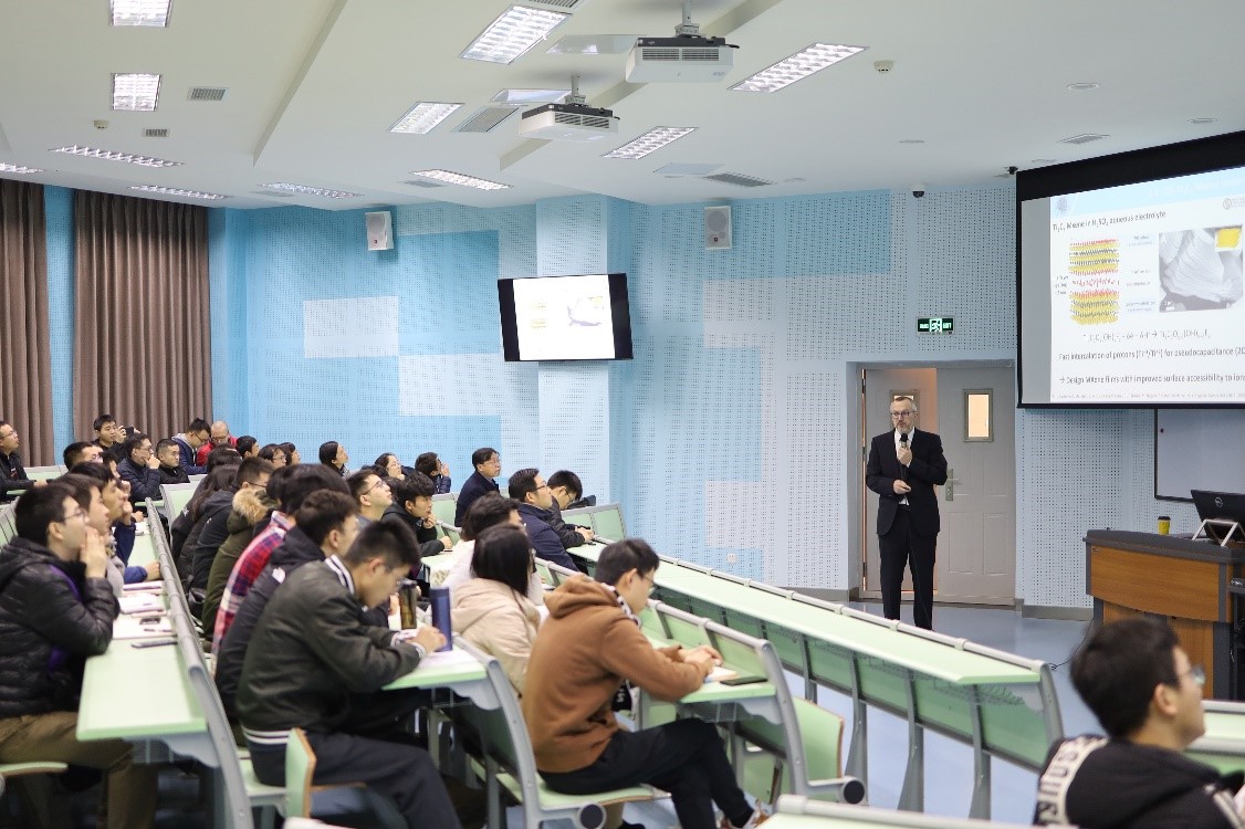 williamhill中国官方网站,William希尔官网入口院长刘颖教授为Patrice Simon教授颁发了特聘院士聘书。接受聘书后,Patrice Simon教授作了题为“Electrochemistry at nanoscale: understanding ion adsorption/transfer in supercapacitor electrodes”的学术报告,介绍了多孔碳与赝电容材料的研究现状及所面临的挑战。首先讲解了碳材料孔结构与电解液离子尺寸效应,阐明了合理选择电解液离子尺寸及设计多孔碳结构的重要性。此外,Simon教授介绍了具有赝电容行为的氧化物和二维过渡金属碳化物(MXene)的电化学行为,并阐述了赝电容电极材料的重要发展潜力。Patrice Simon教授深入浅出的讲解了超级电容器及电池储电机制,让到场师生受益匪浅。报告结束后,在场师生与Simon教授积极互动,对相关科学问题进行了深入探讨。