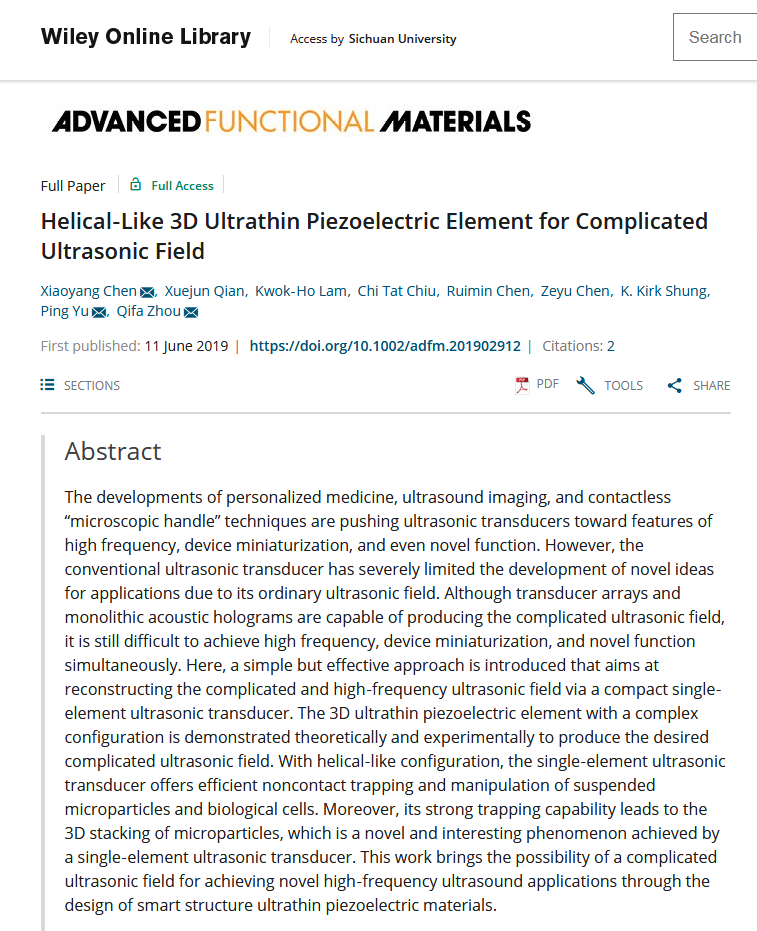 近日,williamhill中国官方网站余萍教授团队,与美国南加州大学、香港理工大学合作的“使用3D复杂结构的超薄压电敏感元来构建超声复杂声场的研究”课题相关成果,在国际著名材料期刊Advanced Functional Materials (IF=15.621)以原创性论著形式发表。该工作针对当前超声技术发展的趋势:新功能、高频以及器件微型化,首次提出利用复杂3D结构的超薄压电敏感元实现复杂的高频超声场。论文第一作者是材料学院专职博士后陈潇洋,材料学院余萍教授和美国南加州大学周岐发教授为共同通讯作者。williamhill中国官方网站为该论文的第一署名单位。