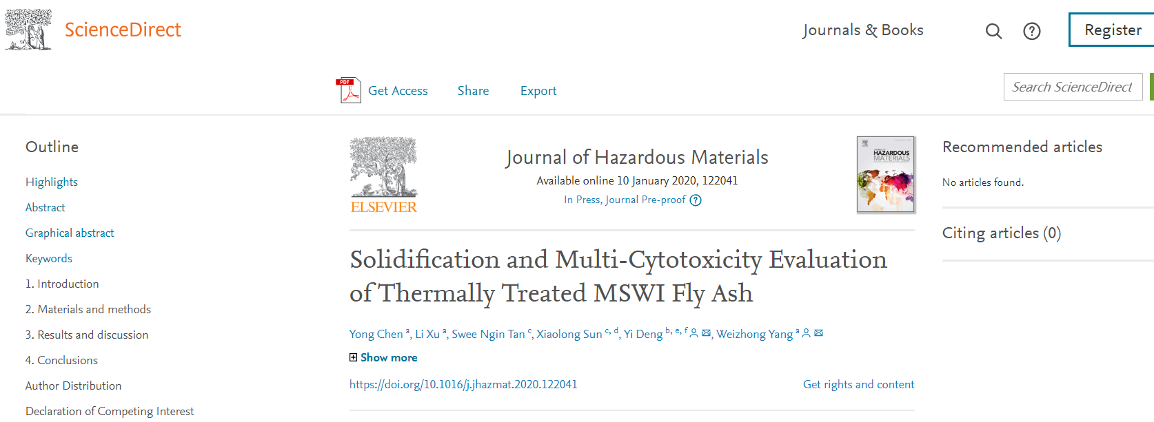 近日,williamhill中国官方网站,William希尔官网入口杨为中教授与新加坡南洋理工大学Swee NginTan教授、新加坡Zerowaste Asia Co. Ltd.公司Sun XiaoLong博士以及williamhill中国官方网站化工学院邓怡副研究员合作,在危险废弃物的处理和评价领域取得重要进展,相关研究成果“Solidification and Multi-Cytotoxicity Evaluation of Thermally Treated MSWI Fly Ash”以williamhill中国官方网站为第一单位发表在环境科学固废领域顶级期刊Journal of Hazardous Materials上(中科院一区,影响因子7.65),论文第一作者为williamhill中国官方网站,William希尔官网入口2018级硕士研究生陈勇同学,论文第二作者为williamhill中国官方网站,William希尔官网入口2017级本科生徐利同学。