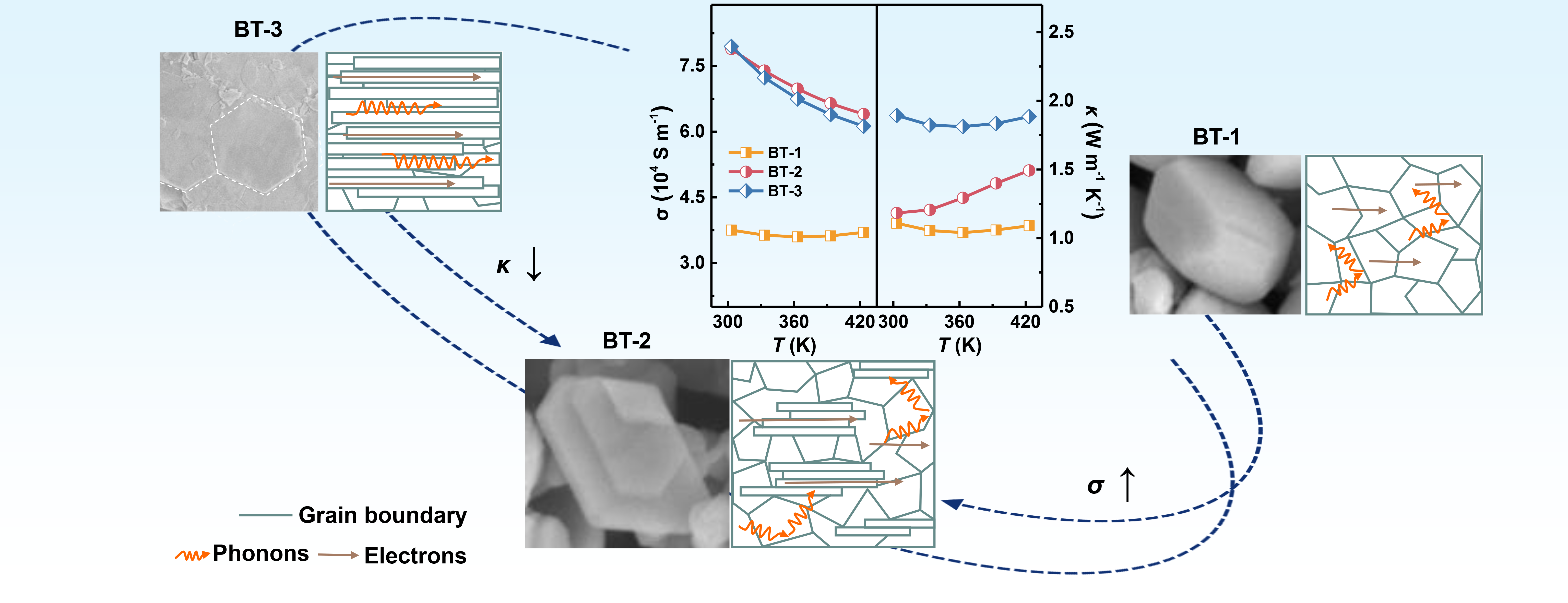 为此,作者设计了一种利用纳米结构工程实现Bi2Te3织构化的方法,在利用溶剂热法合成了形貌可控的Bi2Te3纳米结构(纳米颗粒、阶梯状纳米板和超薄纳米板)的基础上,采用放电等离子烧结(SPS)得到不同织构度的烧结块体。由于不同的形貌导致纳米结构的堆积方式不同,烧结后碲化铋块体中的织构度也不同,良好的协调了样品的电性能和热性能。研究结果表明:织构工程的关键是平衡良好的电子传输特性和低热导,只有样品在具有合适的织构度和纳米晶粒的情况下展现的高功率因子(S2σ)和低热导率(κ),能有效提高热电优值(ZT)在室温段的峰值(333 K时ZT值达到0.69)。本研究也为通过织构工程开发具有层状结构的高性能热电材料提供了指导。