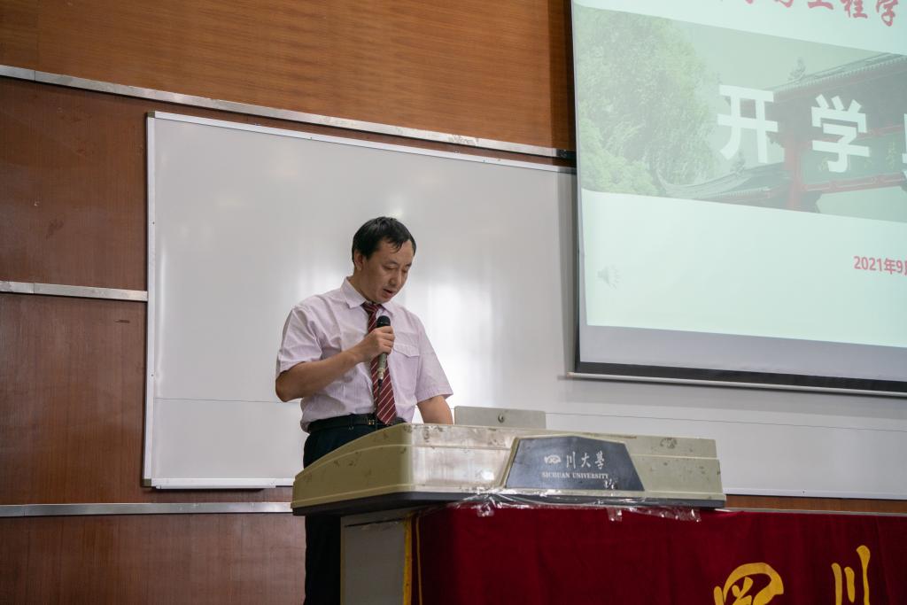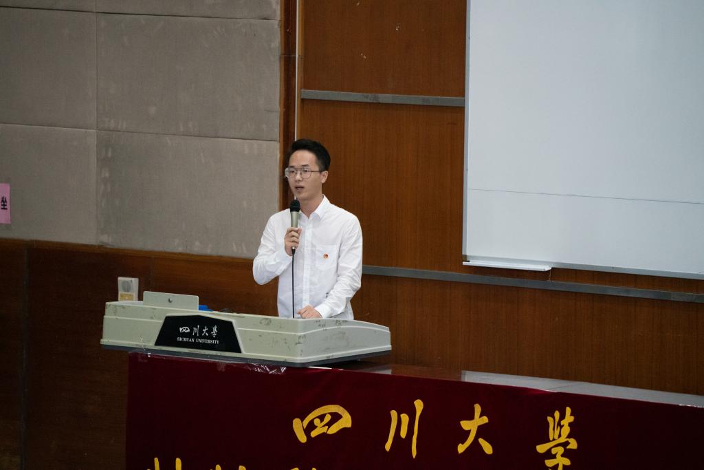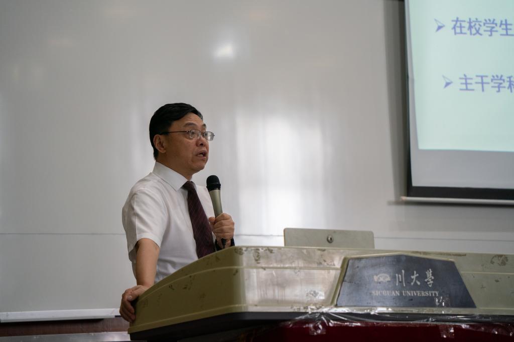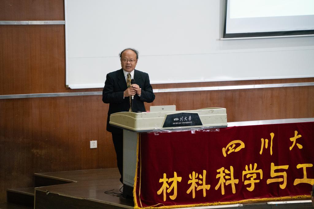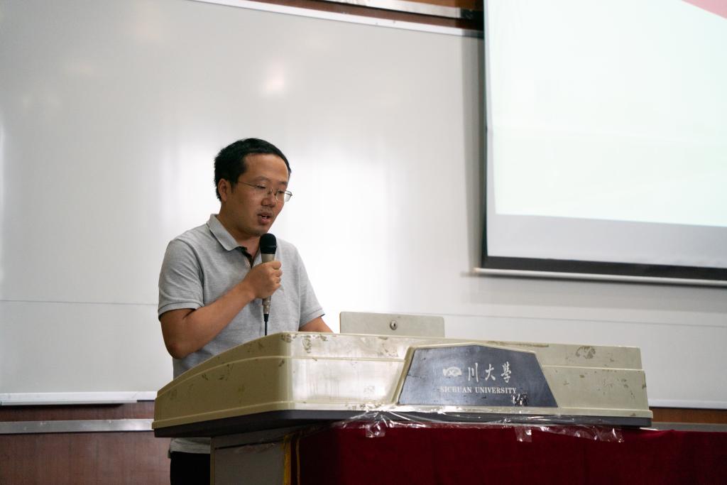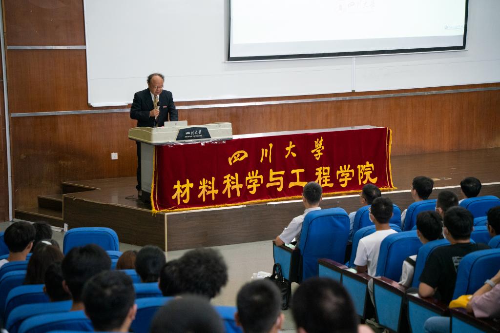 在刘颖院长介绍完学院情况之后,学院教师代表王泽高研究员代表材料学院全体教师发表讲话。他以自己从农村长大再到在川大教书的经历出发,向全体新生们提出了三点建议,要学会做人,学会做事,学会做学问,并希望同学们能在川大校园里百尺竿头更进一步!