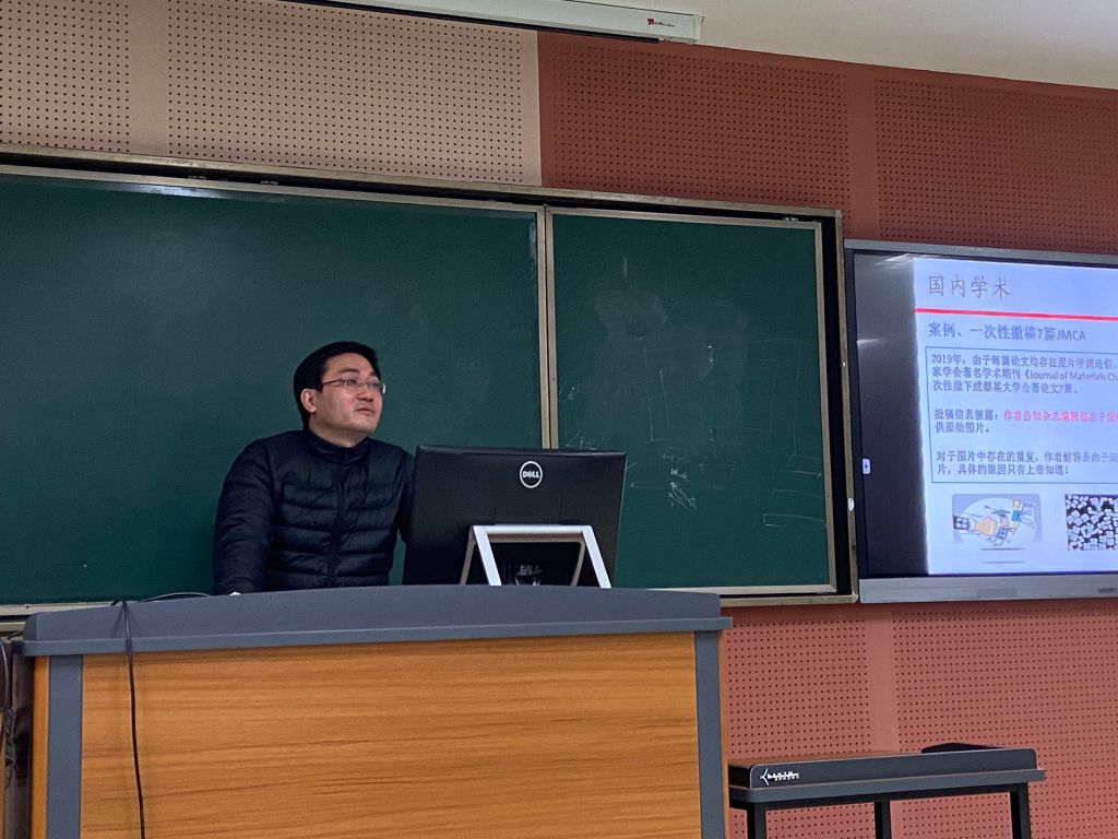 吴家刚教授根据同学们对于学术不端行为的认知程度,从学术不端的定义和危害性出发,同时以国家对于学术不端出台的法规条例及具体案例作为实际补充,为同学们讲解了学术不端对于科研道路的严重危害性,告诫同学们要恪守学术诚信,拒绝学术不端。