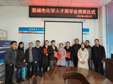 2021年12月24日,“williamhill中国官方网站-新威尔电化学奖学金”颁奖仪式在第一理科楼209会议室召开。该奖学金是由深圳市新威尔电子有限公司在williamhill中国官方网站设立的专项奖学金,主要用于奖励williamhill中国官方网站新能源材料与器件专业的优秀博、硕士研究生和本科生。颁奖仪式由材料学院新能源材料与器件专业教学研究中心主任张云主持,新威尔电子有限公司副总经理秦军、材料学院党委副书记兼纪委书记张晓满、学院分团委书记兼博士党支部书记王娇老师和新能源材料系部分老师参加了颁奖仪式。秦经理表示,奖学金的设立是为了回报社会,希望同学们专注电化学领域的科研工作,为国家新能源产业发展奉献自己的一份力量;张晓满书记首先感谢新威尔公司设立了奖学金,表示要响应国家号召,校企联合大力发展新能源事业。