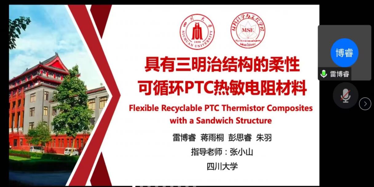 在宣讲会中段,由雷博睿学长分享自己的比赛经历,并对材料知识进行了科普和讲解。他从解释材设大赛名字的由来入手,分析材料设计大赛的同时,也提出了所设计的参赛材料要兼具创新性和可行性的观点。另外,雷学长也在线上进行了精彩的五分钟答辩演示,给将要参赛的队伍提供参考,专业客观、言简意赅的阐明了他所带领的团队将参赛的PTC热敏电阻材料在实验和应用领域展现的可行性和可拓展性。雷博睿学长的精彩分享后,由严悦学姐分享参赛经验,帮助同学们在参赛时规避弯路,尽快入题。同时,严学姐建议参赛选手在展现题材时要简洁大方、强调重点,同时结合比赛要求制定大纲。严学姐所带来的高分子纳米材料也给予大家学科交叉、创新融合的比赛思路。