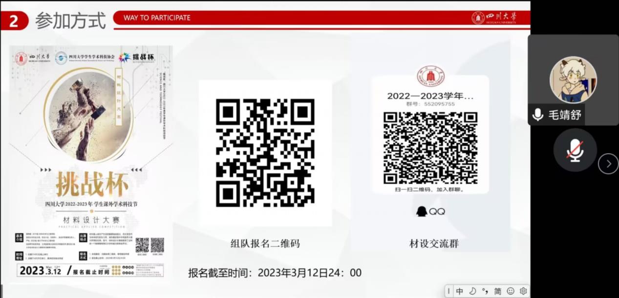 此次宣讲会邀请到了主持国家级大创项目的严悦学姐以及担任“互联网+”、挑战杯等项目负责人的雷博睿学长作为主讲嘉宾分享相关赛事经验。并由材料分科协成员介绍赛事规则、赛事流程。期间线上同学们积极发问,营造了良好的问答氛围。