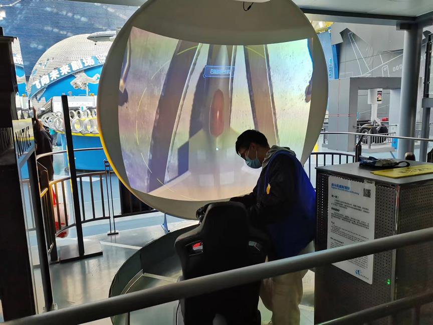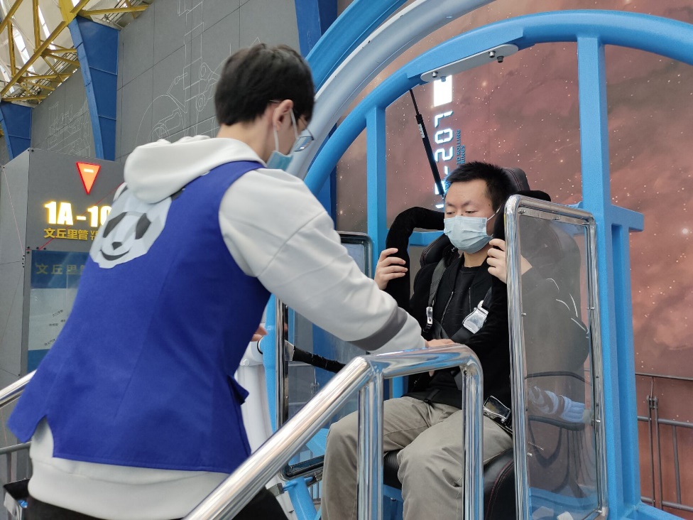 去到一楼“三问—问天、问水、问未来”展厅的成员同科技馆的工作人员一起负责体验项目的运行,为游客穿戴体验装置,讲解其中的科学知识,提供更好的游览体验。