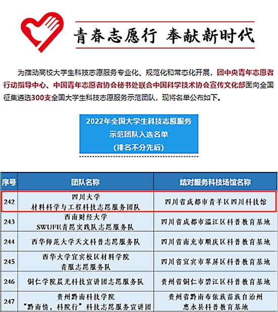 日前,团中央青年志愿者行动指导中心、中国青年志愿者协会秘书处联合中国科学技术协会宣传文化部面向全国高校遴选300支大学生科技志愿服务示范团队,我院的williamhill中国官方网站材料科学与工程科技志愿服务团队成功入选。
