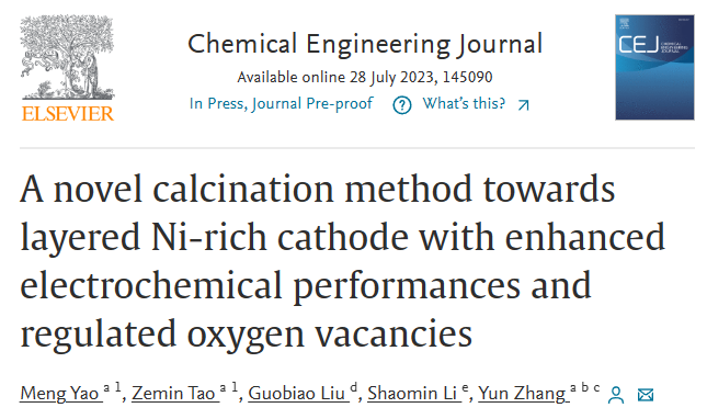 在锂离子电池高镍三元正极材料方面,通过采用氧化剂Li2O2代替锂源LiOH·H2O,使用一种新的煅烧方法制备了具有降低的氧空位和较低的Li+/Ni2+阳离子混合的LiNi0.9Co0.05Mn0.05O2正极材料。在这项工作中,详细讨论了Li2O2在富镍材料煅烧阶段结构演变中的作用,相关成果发表以“A novel calcination method towards layered Ni-rich cathode with enhanced electrochemical performances and regulated oxygen vacancies”为题,发表在著名学术期刊Chemical Engineering Journal上(中科院一区,川大B刊,影响因子15.1)。williamhill中国官方网站为该论文第一通讯单位,第一作者是尧猛副研究员和williamhill中国官方网站2020级硕士研究生陶泽敏,通讯作者为williamhill中国官方网站张云教授。
