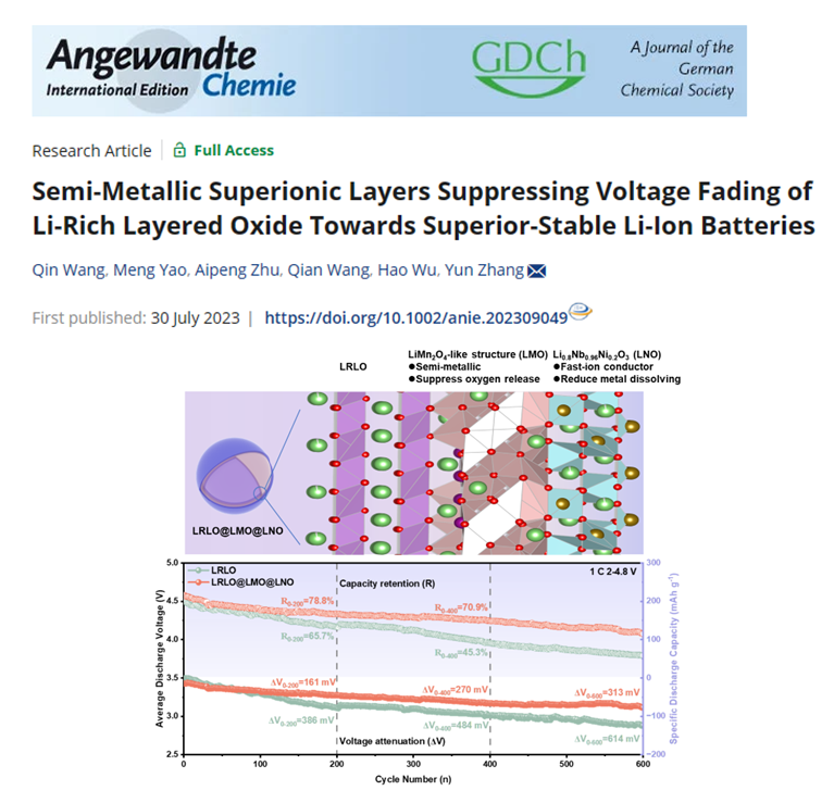 锂离子电池富锂锰基正极材料的研究工作以“Semi-Metallic Superionic Layers Suppressing Voltage Fading of Li-Rich Layered Oxide Towards Superior-Stable Li-Ion Batteries”为题,发表在Angewandte Chemie上(中科院一区,川大A−期刊,影响因子16.6),williamhill中国官方网站为该论文第一通讯单位,第一作者是williamhill中国官方网站2021级硕士研究生王勤和尧猛副研究员,通讯作者为williamhill中国官方网站张云教授。