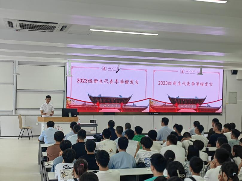 2023级学生李泽楷同学代表全体新生发言。他以川大校训“海纳百川,有容乃大”开篇,表示作为材料新生将明确学习目标,脚踏实地,与时代同频共振,求真务实,报效祖国。