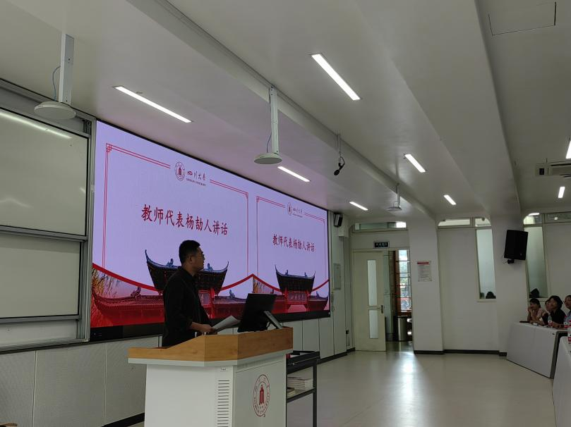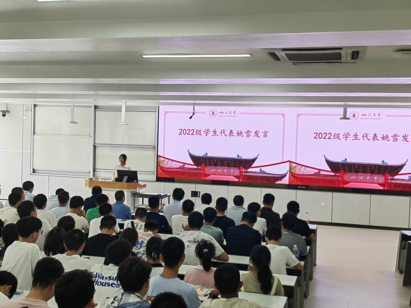 2022级学生姚雪同学代表各位学长学姐发言。她以自己一年来在川大的所见所闻希望学弟学妹们能够珍惜时间、努力学习、充分利用学院教育资源,在日常生活中培养综合能力,施展个人才华,度过充实的大学四年。
