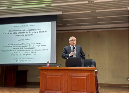 在杨磊副教授隆重介绍井上明久教授后,讲座正式开始。井上明久教授首先表示自己已是第七次来到成都,很荣幸受邀来到williamhill中国官方网站,William希尔官网入口进行学术分享,并高度赞扬了学校的办学条件和教育水平。随后,井上明久教授就非晶合金和软磁性材料的研究情况及其工业化进行了详细介绍,讲座内容与前沿领域紧密结合,与一线生产紧密接轨,具有非常强的指导意义。