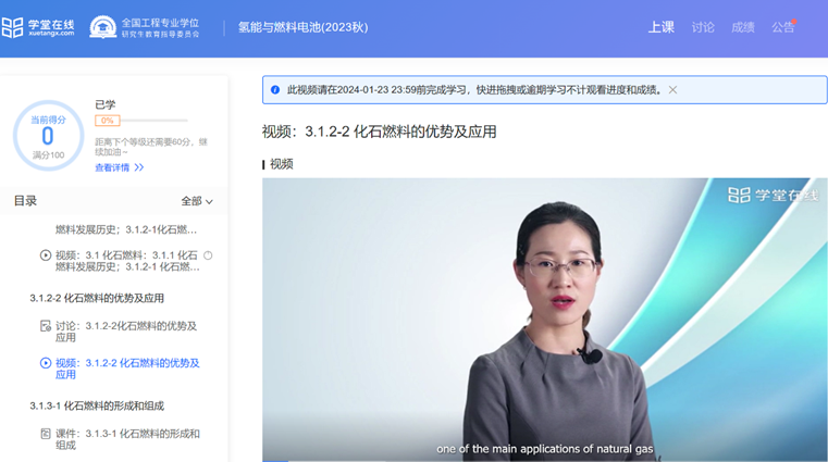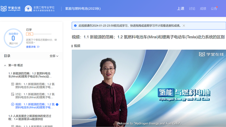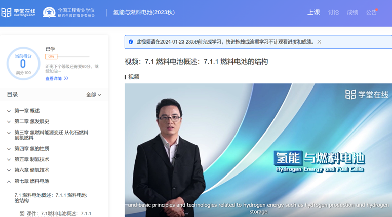 《氢能与燃料电池》教学团队根据该类课程面对的学生群体特点,添加了英文字幕,更新了习题库等,展现出工程类专业学位研究生在线示范课程的创新性、高阶性和挑战度等基本特征。该课程已于2023年9月在学堂在线平台正式上线。