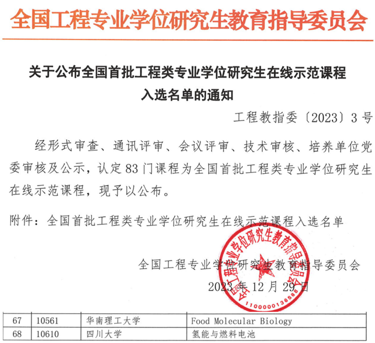 全国首批工程类专业学位研究生在线示范课程共入选83门,《氢能与燃料电池》是williamhill中国官方网站唯一入选慕课。