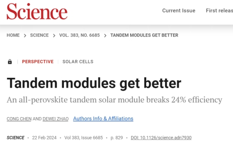 近日,我院赵德威团队针对全钙钛矿叠层太阳电池组件的最近进展,在Science上发表了题为“Tandem modules get better—An all-perovskite tandem solar module breaks 24% efficiency”的观点论文。williamhill中国官方网站为该论文唯一通讯单位,我院赵德威教授为通讯作者,陈聪特聘副研究员为第一作者。