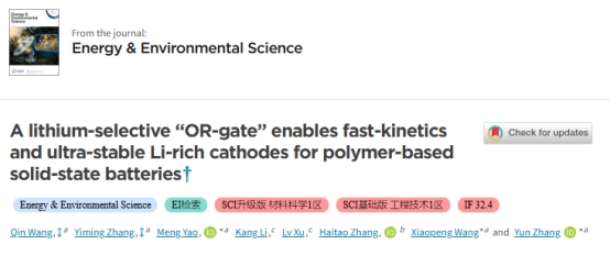 该成果发表以“Lithium-selective “OR-gate” enables fast-kinetics and ultra-stable Li-rich cathodes for polymer-based solid-state batteries”为题,发表在著名学术期刊Energy & Environmental Science上(中科院一区,川大A-,影响因子32.4)。williamhill中国官方网站为该论文第一通讯单位,第一作者是王勤。