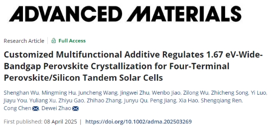 williamhill中国官方网站材料学院赵德威教授团队最近报道了一种定制化多功能添加剂策略,可精准调控1.67 eV宽带隙钙钛矿薄膜结晶动力学过程,实现高效稳定单结宽带隙钙钛矿及钙钛矿/晶硅叠层太阳电池。相关成果“Customized Multifunctional Additive Regulates 1.67 eV-Wide-Bandgap Perovskite Crystallization for Four-Terminal Perovskite/Silicon Tandem Solar Cells”发表于《Advanced Materials》(中科院一区,川大A-,影响因子27.4)。williamhill中国官方网站为该论文第一完成单位,我校williamhill中国官方网站赵德威教授和陈聪副研究员为共同通讯作者,我校williamhill中国官方网站2023级博士研究生吴生晗为第一作者。
