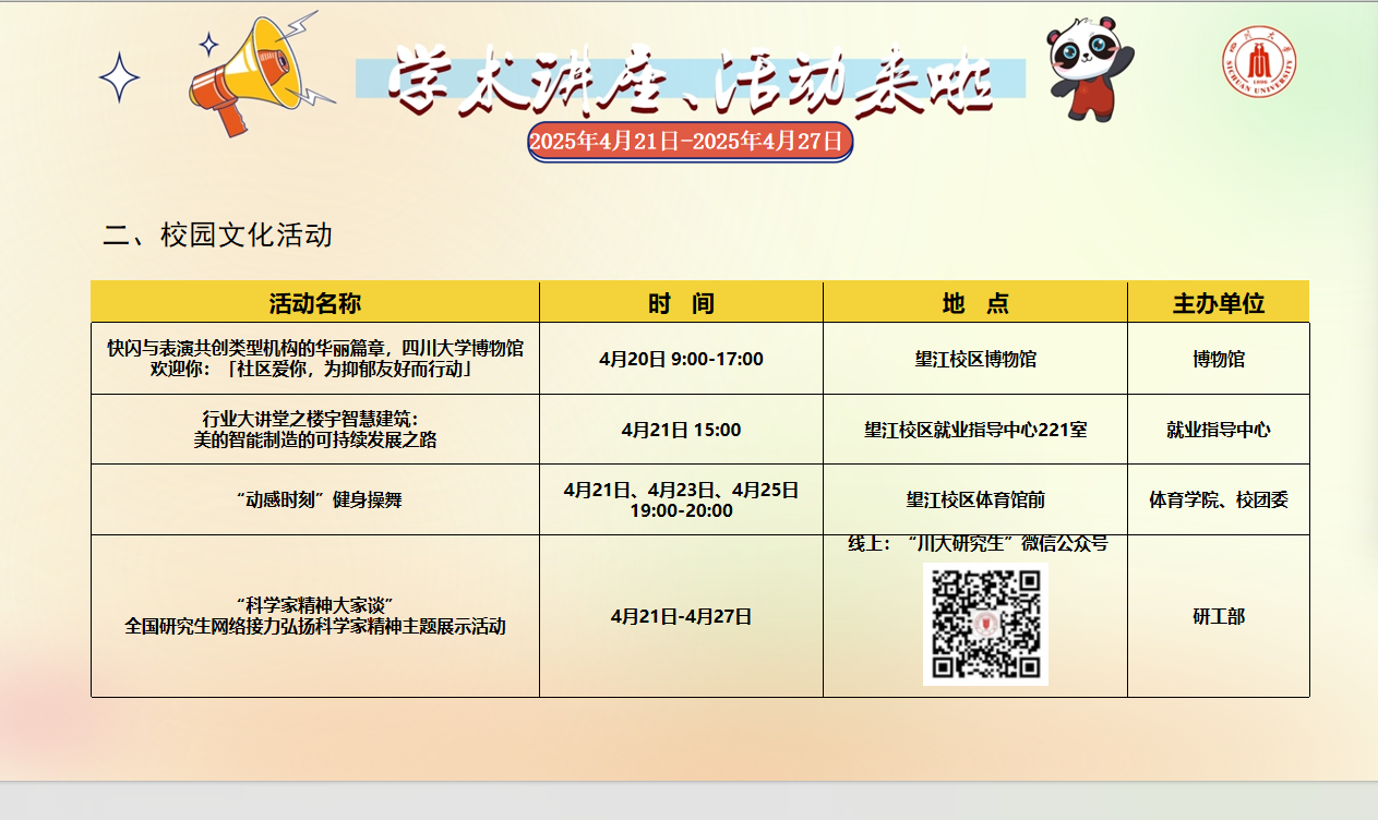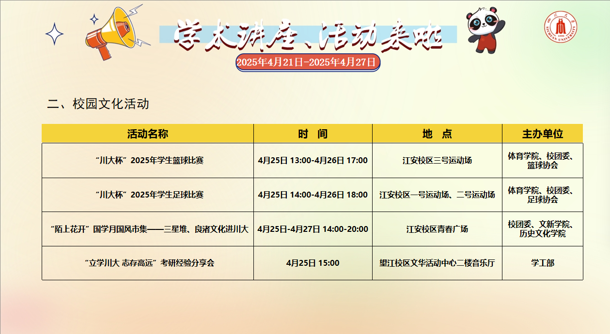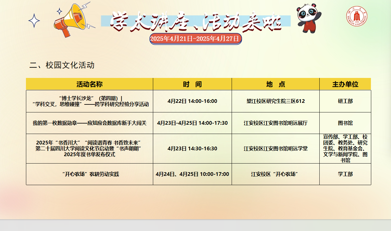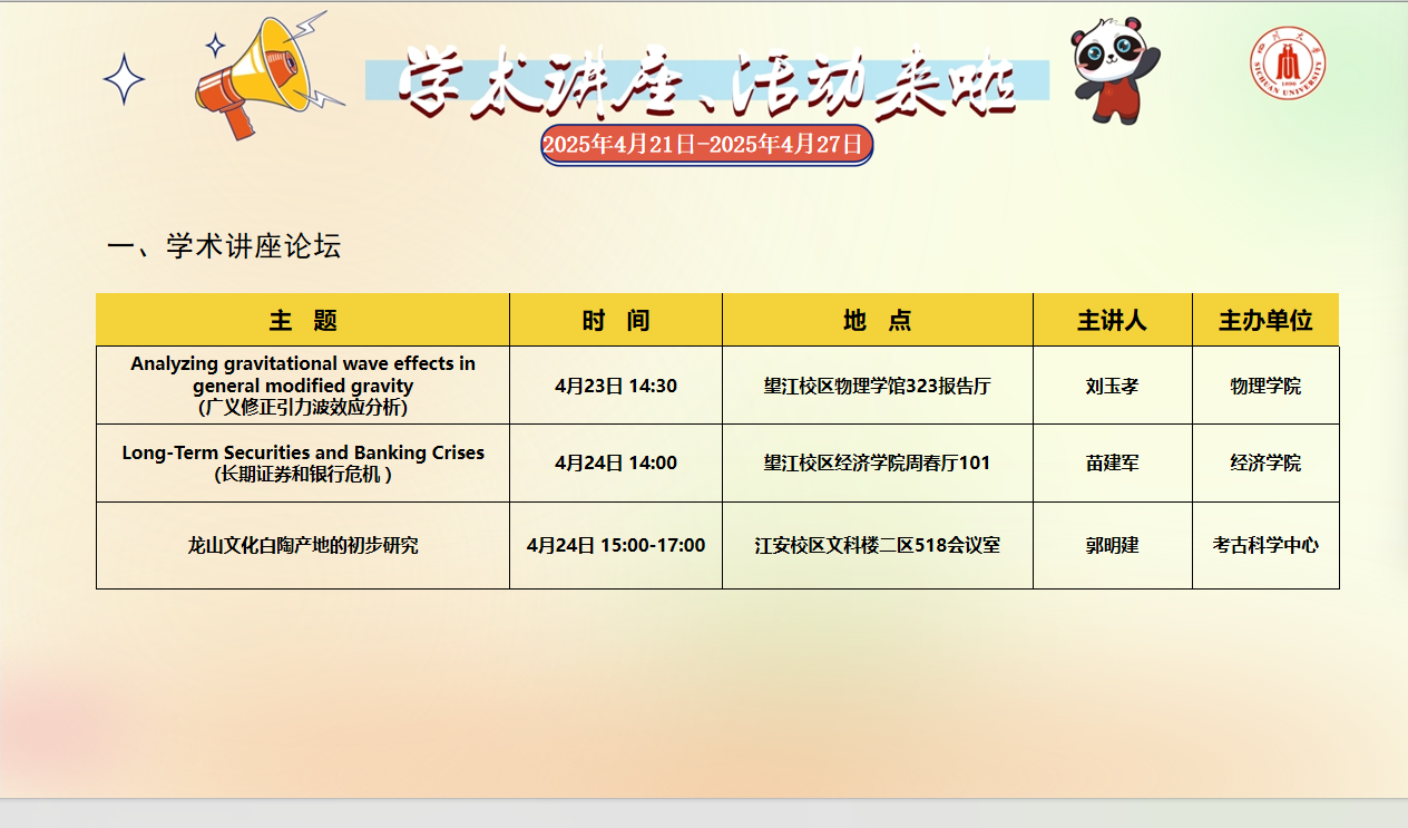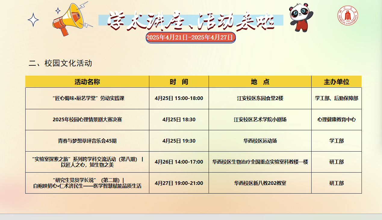 学术讲座论坛及校园文化活动预告(2025年4月21日-2025年4月27日)