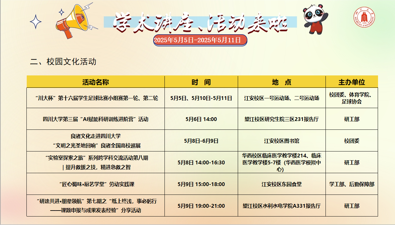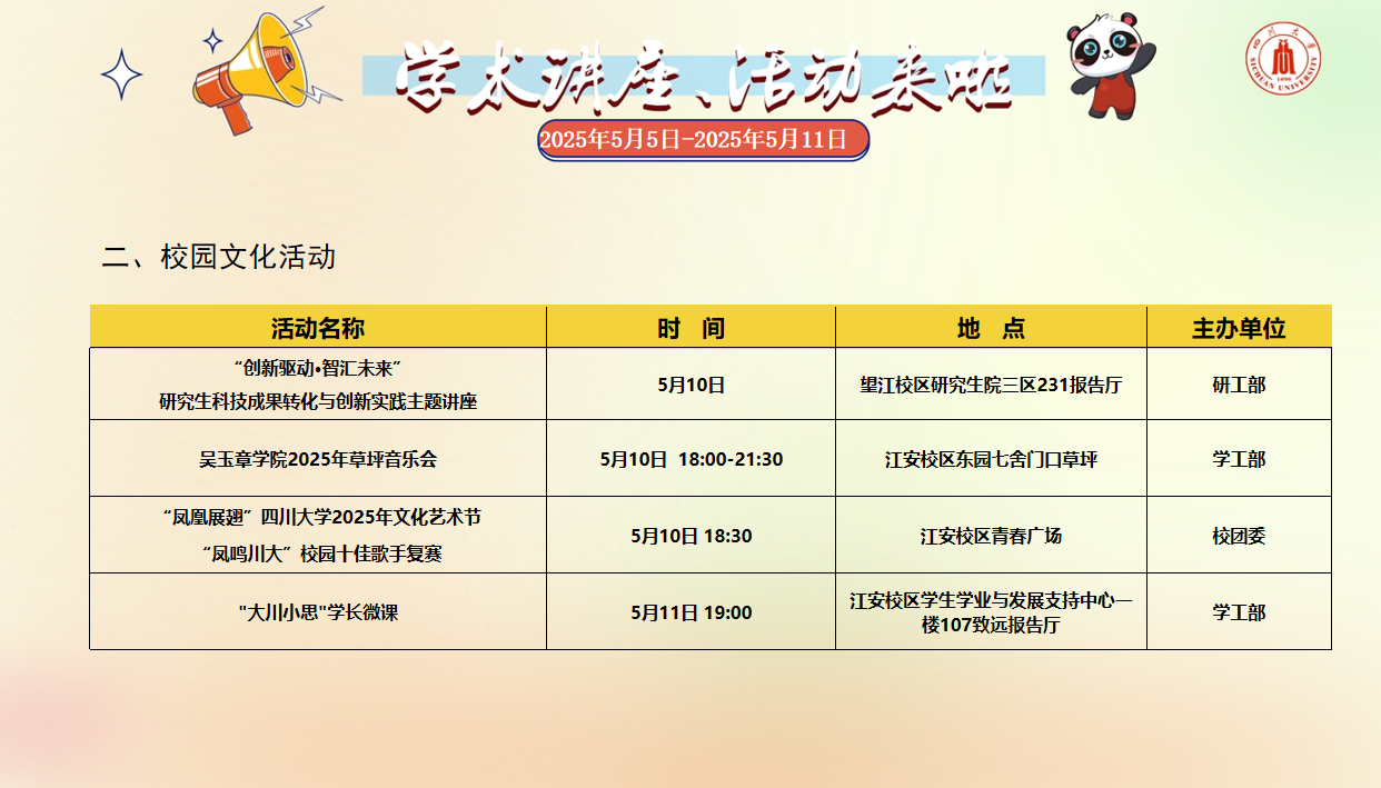 学术讲座论坛及校园文化活动预告(2025年5月5日-2025年5月11日)