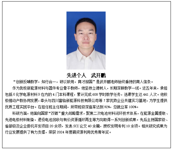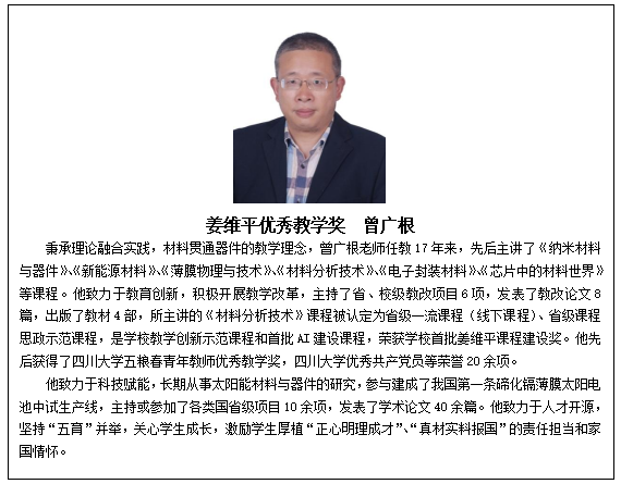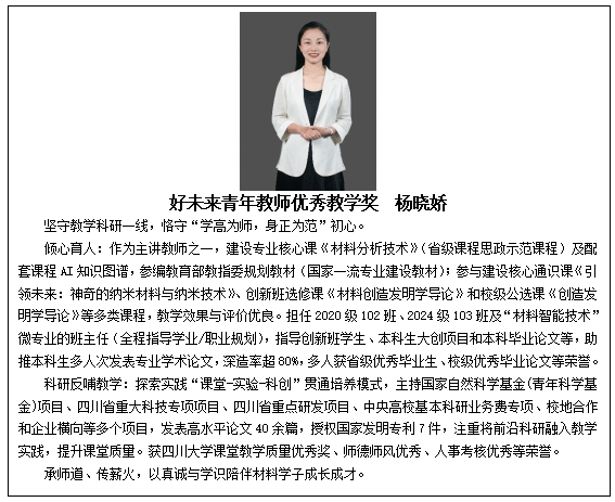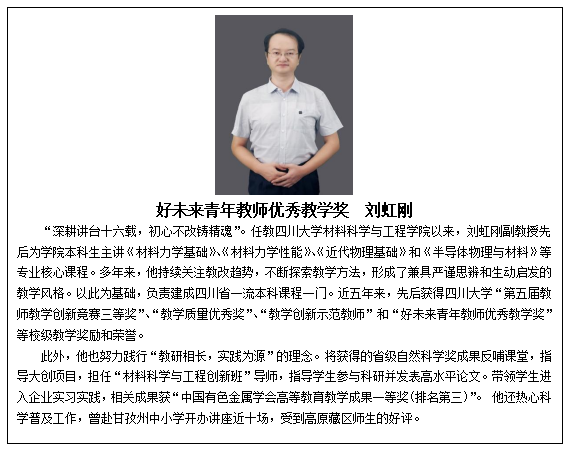 一年来,我院教职工认真贯彻党的教育方针,坚持立德树人,恪守职业操守,在教学、科研、管理等岗位上辛勤工作、无私奉献,推动学院各项事业不断取得新的进步,6名教师受到学校表彰,他们是:吴朝玲(卓越教学奖)、曾广根(姜维平课程建设奖)、刘虹刚(好未来青年教师优秀教学奖)、杨晓娇(好未来青年教师优秀教学奖)、连利仙(优秀共产党员)、武开鹏(先进个人)。祝贺每一位获奖教师,希望全院教职工以受到表彰的先进典型为榜样,不忘立德树人初心,牢记为党育人、为国育才使命,以更加饱满的热情、更加昂扬的斗志、更加扎实的作风,共同谱写材料学院高质量发展的新篇章。