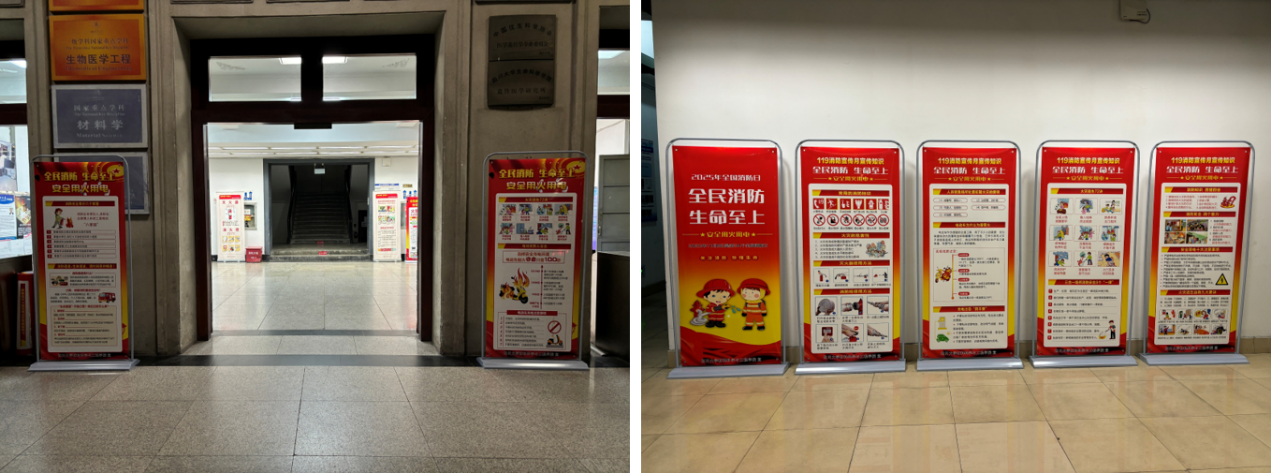 此外,学院在望江东区第一理科楼和西区稀土纳米楼等主要实验场设置了消防安全主题展,通过图文展板普及消防安全意识、违禁电器危害、安全用电常识、应急救援技能等知识,扩大宣传覆盖面,营造浓厚的消防安全氛围。