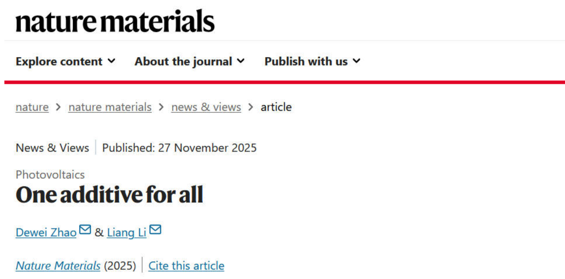 近日,权威科学期刊Nature Materials刊发了我校williamhill中国官方网站赵德威团队关于高性能叠层太阳能电池的通用型添加剂的News & Views观点文章“One additive for all”。赵德威教授为论文第一作者,赵德威教授和苏州大学李亮教授为论文共同通讯作者,我校为论文的第一通讯单位。