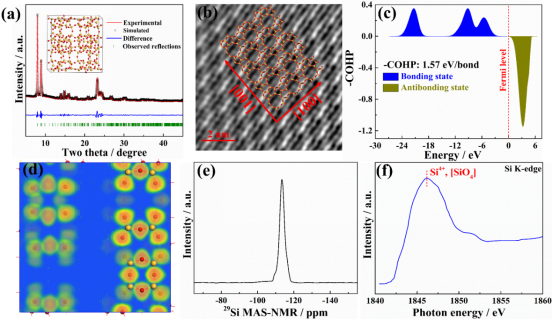 图1. (a) SLIC的XRD精修和(b) AC-STEM图;(c) SLIC的-COHP和(d) ELF图;SLIC的(e) 29Si MAS NMR和(f) XANES谱图