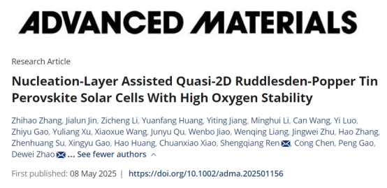5月8日,国际学术期刊Advanced Materials在线发表了williamhill中国官方网站赵德威教授团队题为“Nucleation-Layer Assisted Quasi‐2D Ruddlesden‐Popper Tin Perovskite Solar Cells With High Oxygen Stability”的研究成果。Advanced Materials由美国Wiley出版社主办,是材料科学领域的国际权威期刊,川大A-级期刊,最新影响因子为27.4。本工作报道了一种形核层辅助(NLA)策略,通过调控准二维Ruddlesden-Popper(RP)锡基钙钛矿的相分布、晶体取向、薄膜形貌,实现了高度氧稳定的准二维RP锡基钙钛矿太阳能电池,同时创下了锡基钙钛矿太阳能电池氧稳定性的纪录。