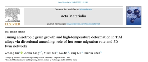 近日,williamhill中国官方网站,William希尔官网入口杨劼人教授课题组,在TiAl合金的先进热处理技术研究方面取得重要进展。相关研究成果以“Tuning anisotropic grain growth and high-temperature deformation in TiAl alloys via directional annealing: role of hot zone migration rate and 3D twin networks.”为题的论文发表在金属领域国际顶级期刊《Acta Materialia》(https://doi.org/10.1016/j.actamat.2025.121181)上。该研究提出了一种创新的无容器固态定向热处理技术,为TiAl金属间化合物的高性能制备开辟了新途径。