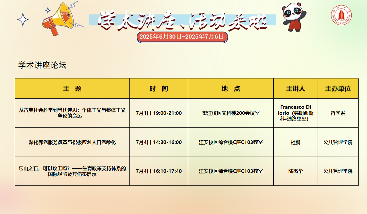 学术讲座论坛及校园文化活动预告(2025年6月30日-2025年7月6日)