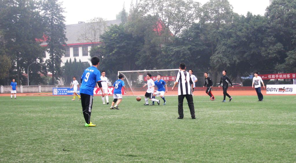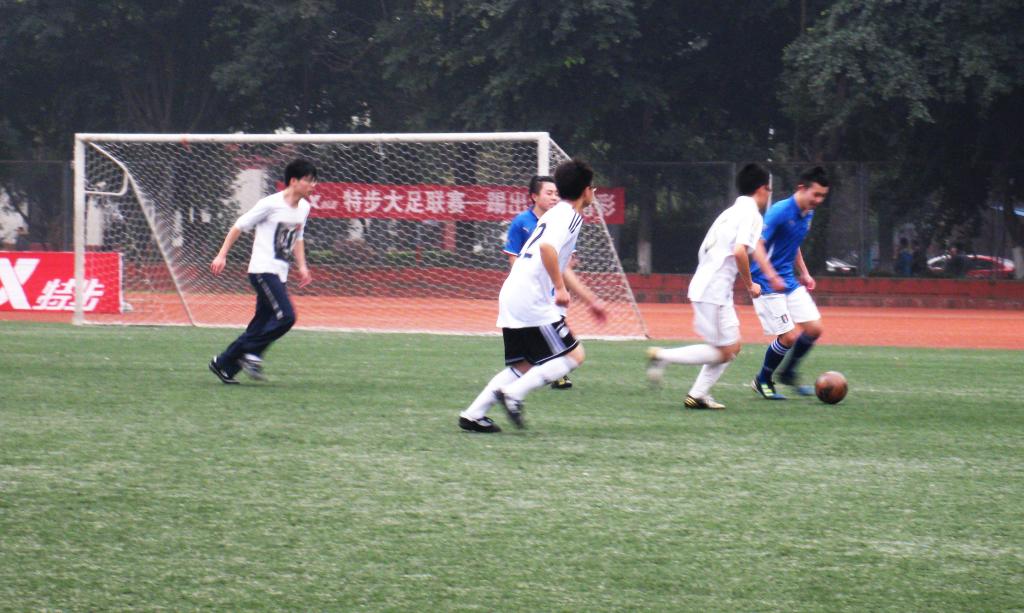 这是学院内部练习对抗赛,但由于各方因素比赛在诸多坎坷后终于拉开序幕。研究生学长们似乎也很想了解我院后备力量的实力,比赛开始显得很是谨慎,双方互攻有无,一直没有进球。在比赛进行到一刻钟时,本科生球员一次长传,球直接到了左边锋脚下,一记单刀直入打开了研究生队球门。研究生队伍很快进行反攻,但未奏效。又是本科生的进攻机会,后卫到中卫球员间不断传送,竟没有失误地到了边锋脚下,这次是一次中距离直射,球门再一次被打开。本科生球员间配合默契,很快进入了比赛节奏,而研究生学长们似乎在场上没能占据着主导,优势一点一点地走向了本科生队伍。尽管上半场研究生球员们不断进攻,但守门员均将球扑出,本科球员们掌握着比赛的进攻节奏,不断打门得分,中场结束以7:1的比分领跑。