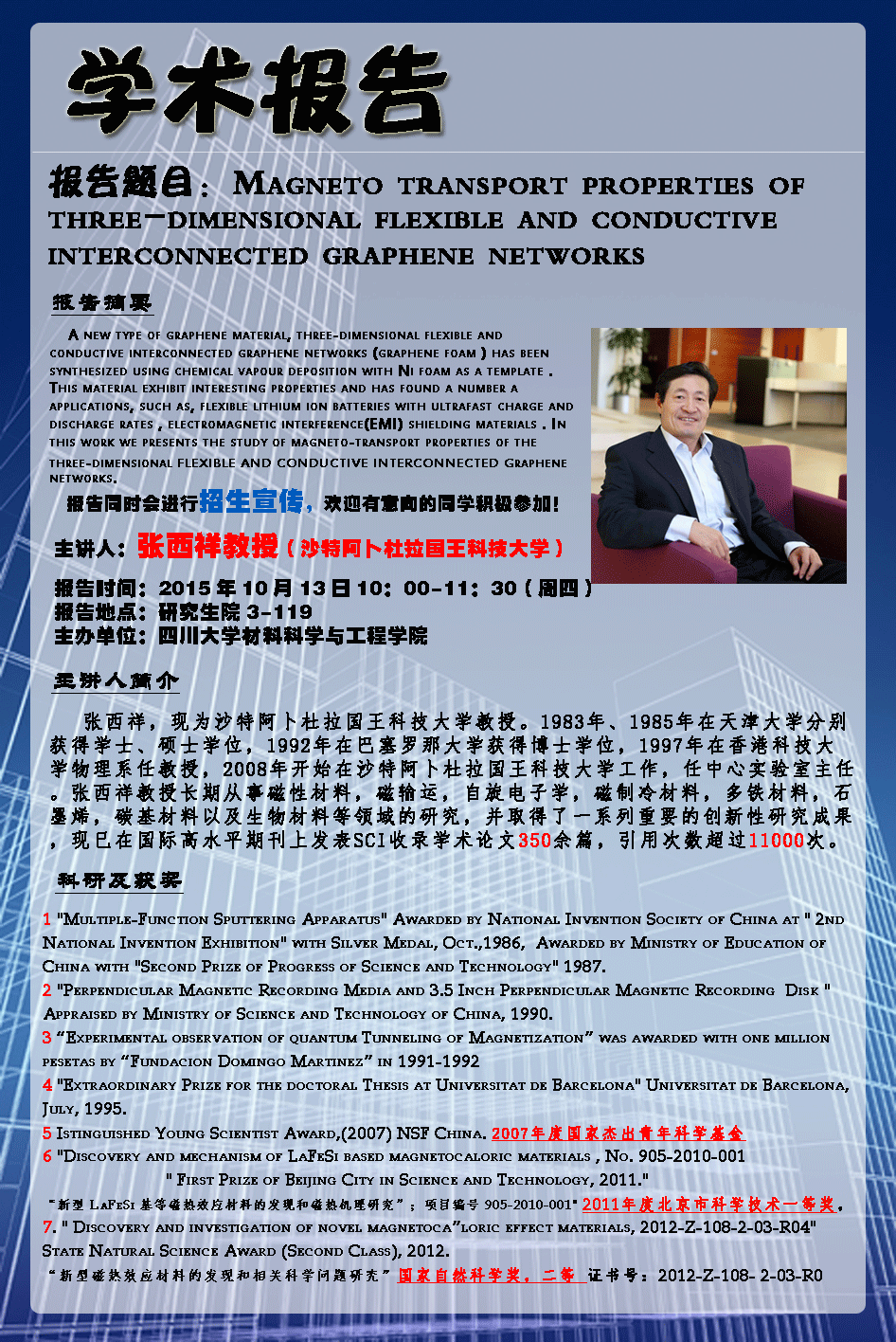 金秋十月,桂花飘香。沙特阿卜杜拉国王科技大学的张西祥教授将受邀来我校作题为:“Magneto transport properties of three-dimensional flexible and conductive interconnected graphene networks”的报告。张教授将关于泡沫石墨烯的相关前沿研究进展与大家进行深入探讨与交流。