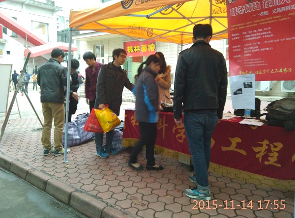 2015年11月13日~2015年11月15日,williamhill中国官方网站,William希尔官网入口研究生分会、williamhill中国官方网站计算机学院研究生分会和williamhill中国官方网站建筑与环境学院研究生分会三学院研究生分会联合举办的“暖冬行动在川大”——冬季衣物、文具募捐活动在williamhill中国官方网站望江校区北苑宿舍、东区桃园餐厅和东园十五舍三处同时进行。