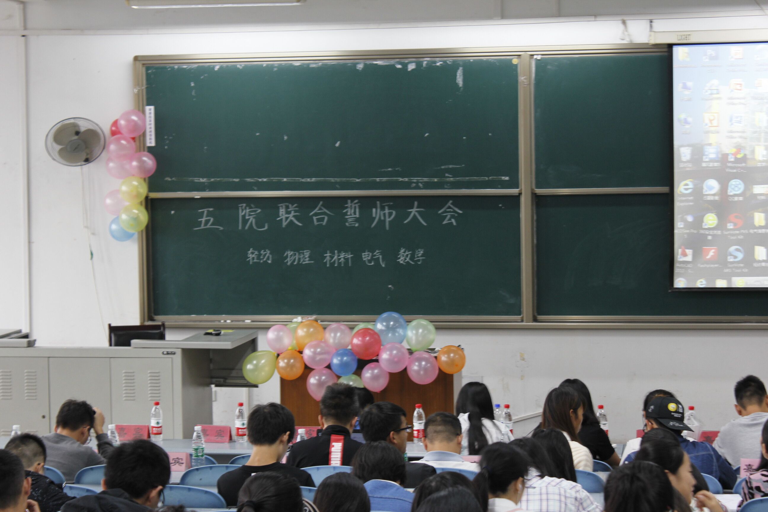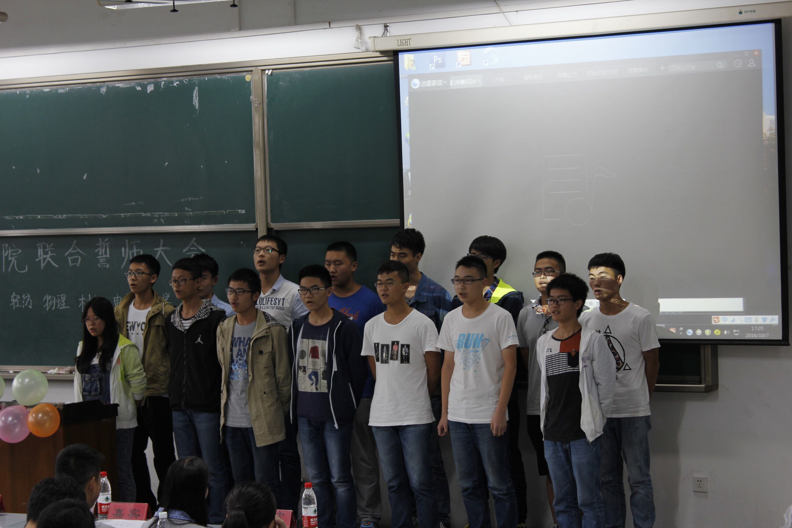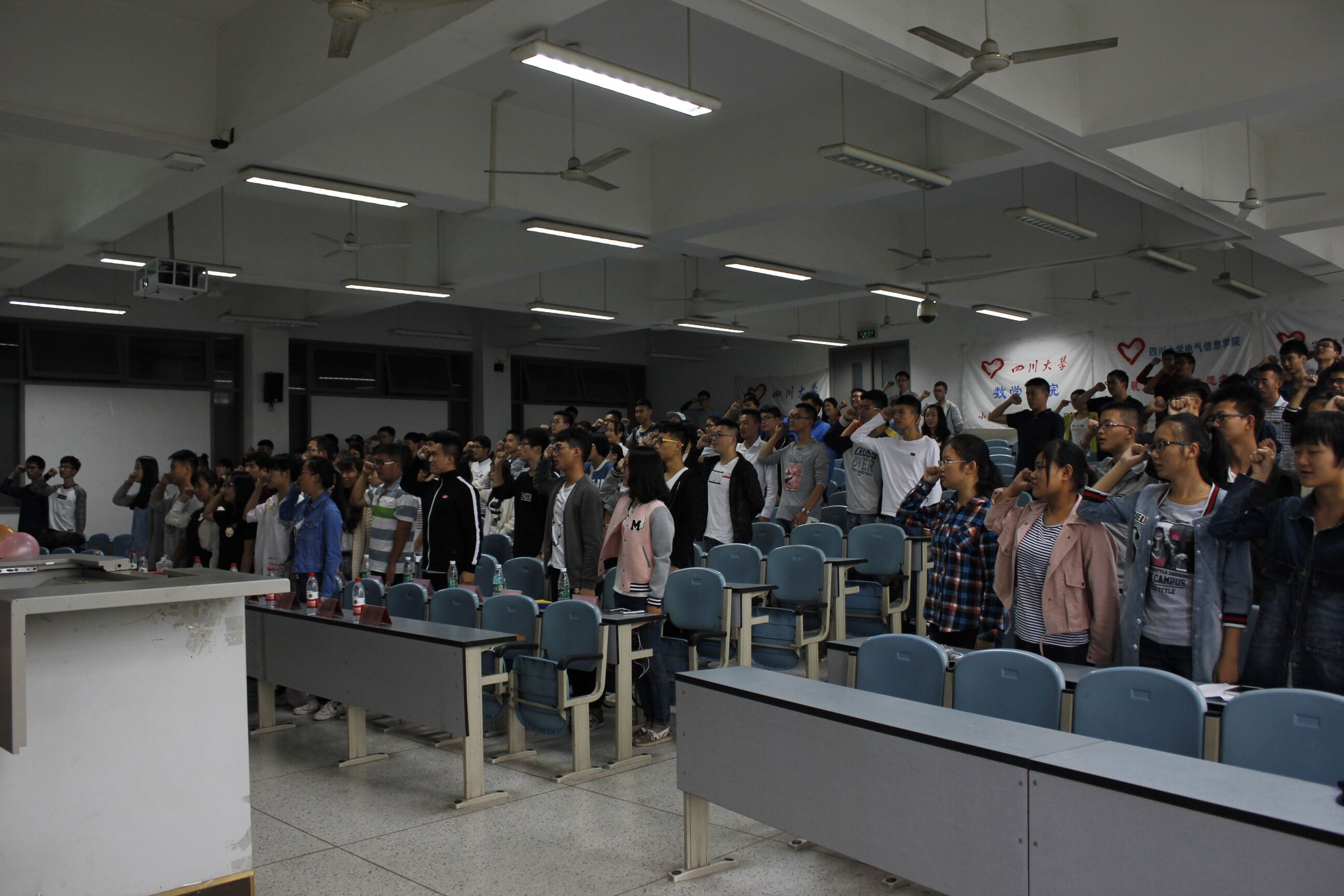 接下来进行的是五院联合誓师仪式,在两位主持人的带领下,所有到会成员起立并举起了右拳,面对这屏幕上的誓词庄严宣誓。