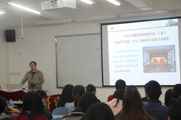 随后,高教授与大家探讨了“怎么学”,也就是如何准确把握十八届六中全会精神的重点内容。高教授认为学习宣传党的十八届六中全会精神,要充分认识确立习近平同志在全党核心地位的重要性,更加紧密地团结在以习近平同志为核心的党中央周围,充分认识党的十八大以来全面从严治党取得的成就,深入学习领会《关于新形势下党内政治生活的若干准则》基本精神,认真学习落实《中国共产党党内监督条例》基本要求,全面准确把握十八届六中全会的精神实质。
