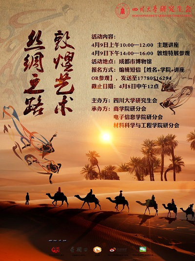 为进一步拉近川大学子与神秘敦煌文化的距离,加深同学们对博大精深的敦煌文化的了解,增强学生对中华传统文化的历史认同感,让大家更深入地了解文明交融的价值和意义所在,从而更好地向大家展示“一带一路”战略的深远影响并坚固大家对中国作为自由贸易世界桥头堡地位的信念。商学院、电子信息学院和williamhill中国官方网站研分会承办的2016-2017学年第三期 “中华文化行“讲座和体验活动即将举行,主题为“丝路之魂·敦煌艺术”。