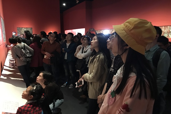 下午1点半,参与活动的同学陆续来到成都博物馆门口集合,下午2点,所有同学集合完毕,排队走进成都博物馆。博物馆工作人员为每位同学发放了一副耳机,用于在参观过程中听到讲解员的细致讲解,这样便克服了周围嘈杂的声音,使得每位同学都能用心感受敦煌艺术的魅力。另外,为了提高参观效率,参与同学被分成了两组,分别跟随不同的讲解员。