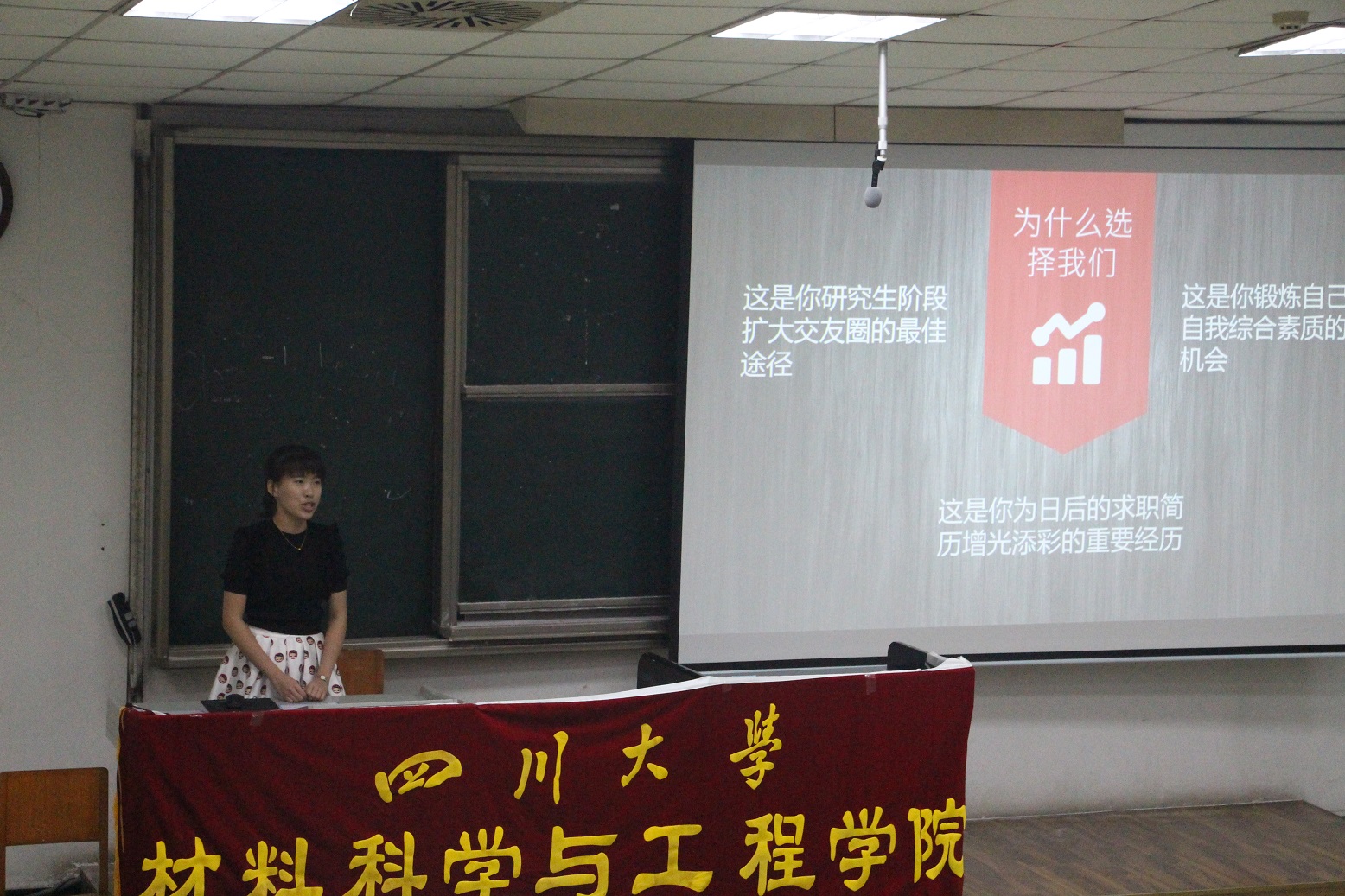 2017年9月15日下午4点,在基础教学楼C104,材料学院研究生分会的各位同学给145位2017级硕、博研究生新生们介绍了材料学院研究生分会各个部门,进行了招新宣传,并热忱希望各位新生加入材料学院研分会。