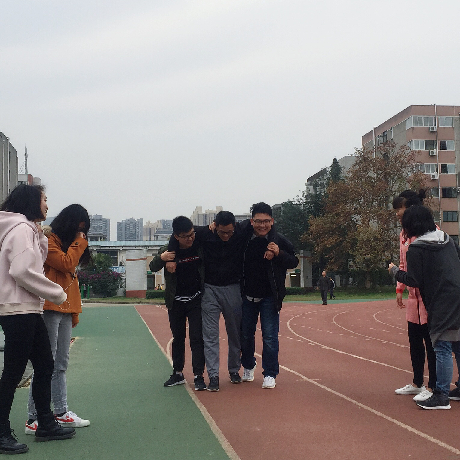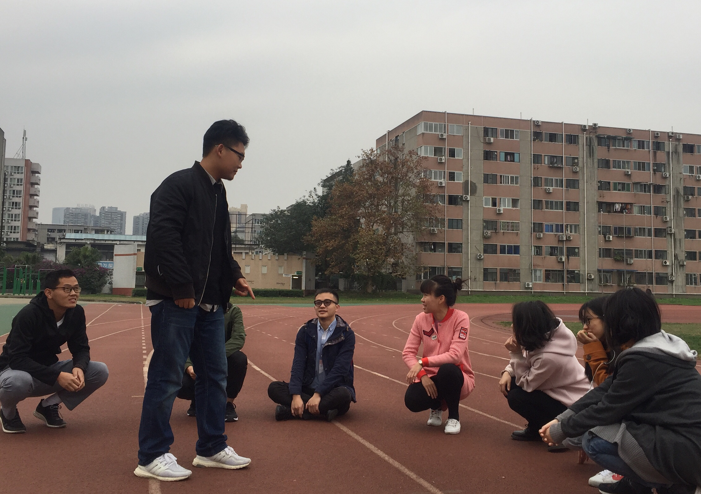 上午9点研分会成员在川大体育馆操场处集合,人员集齐后,一行人便迫不及待地开展了一系列的趣味运动,如三人四足跑,螃蟹赛跑,抱双球接力赛,仙人指路,丢手绢,单腿斗鸡等等。其中最有趣的莫过于三人四足跑了,参赛队员以三人一组参赛,赛道长50米,三个人并排站在一起,把中间人的右脚和他右边人的左脚绑在一起,中间人的左脚和他左边人的右脚绑在一起,整个过程考验的是3个人之间的默契,中间人的作用最为突出,掌控着三人的整体速度,有的组因为默契太差,几乎连续摔倒了好几次,整个过程中都洋溢着观众欢快的笑声以及某些组的惨叫声。