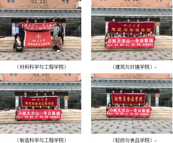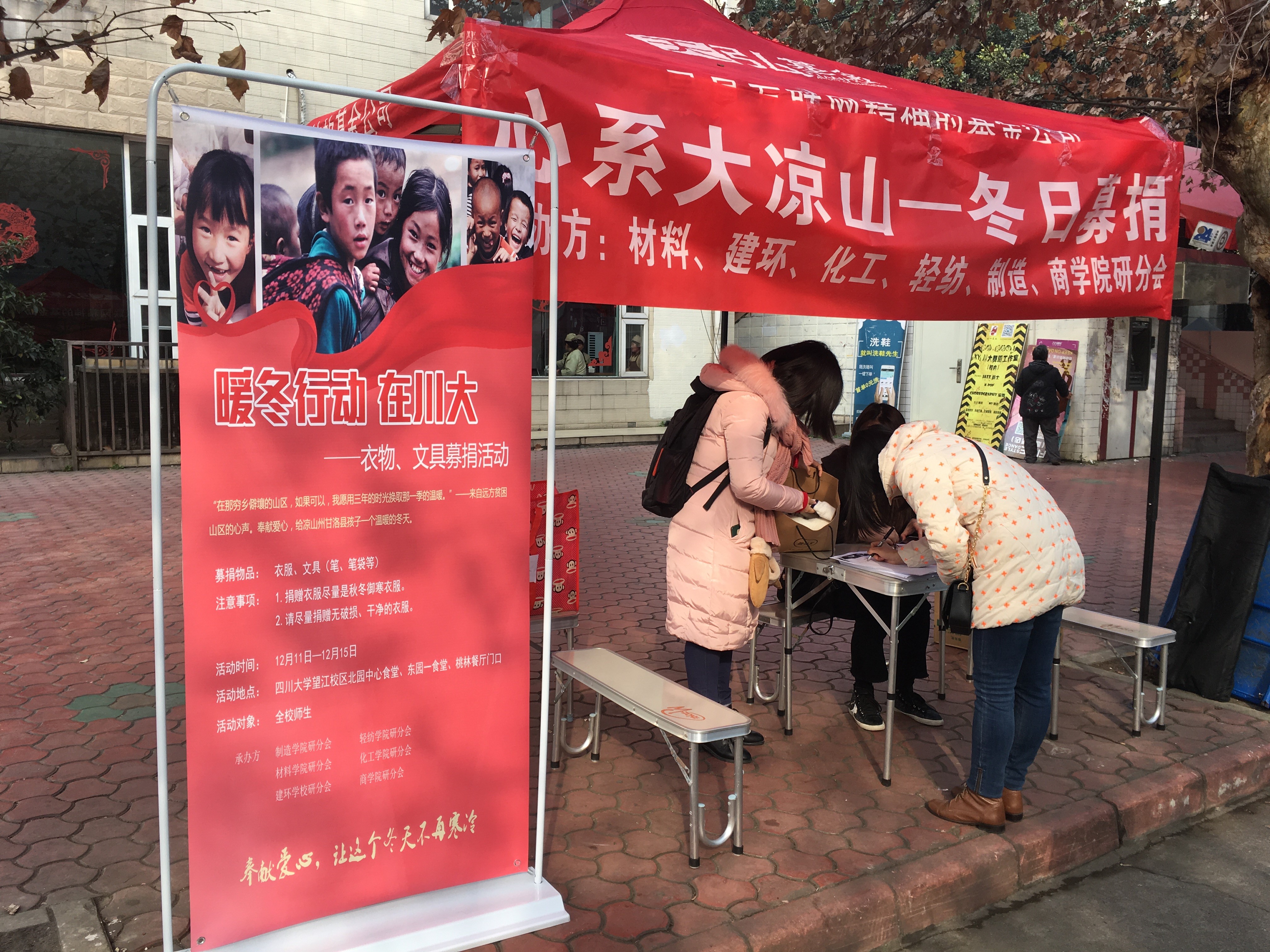 2017年12月11日至13日,由williamhill中国官方网站,William希尔官网入口、建筑与环境学院、制造科学与工程学院、轻纺与食品学院、化学工程学院和商学院六个学院研究生分会联合主办的“砥砺暖风行 心系大凉山”——williamhill中国官方网站爱心冬衣捐赠活动在williamhill中国官方网站望江校区北园中心食堂、东园一食堂、桃园餐厅门口三个捐赠点同时展开,本次活动的募捐物资包括冬衣、书籍、文具用品等,旨在帮助凉山州贫困学生及其家庭改善生活条件,为大凉山美姑县的孩子们开启一个有爱而温暖的冬季。