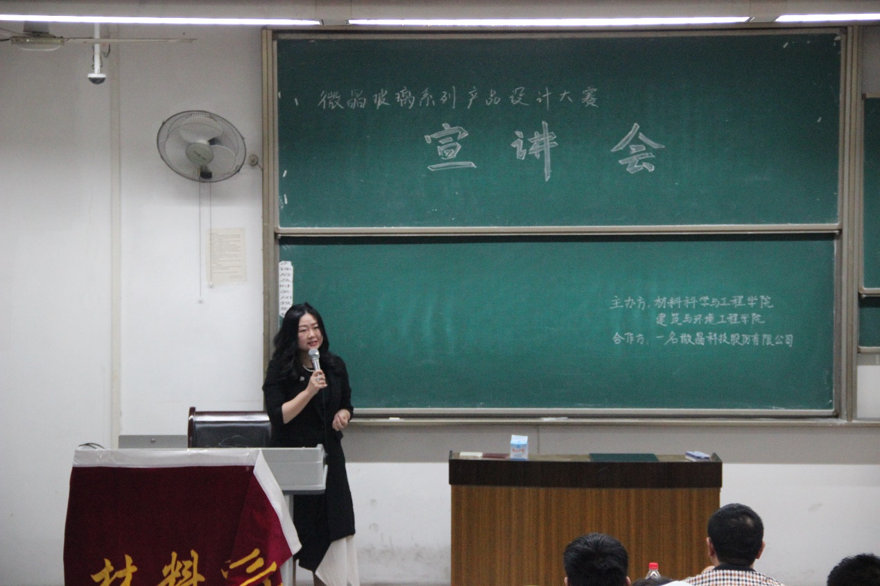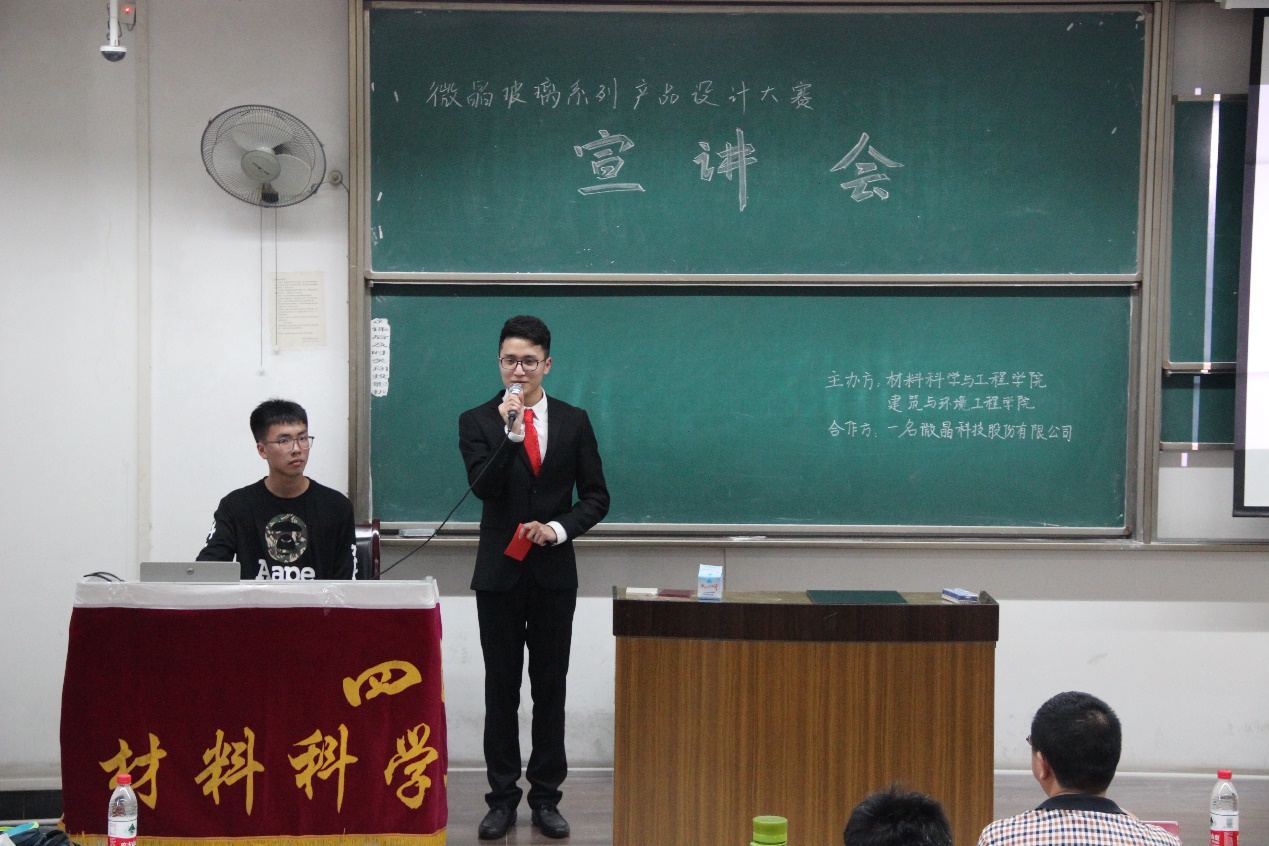 4月1日晚7时整,由williamhill中国官方网站,William希尔官网入口、建筑与环境工程学院主办,williamhill中国官方网站,William希尔官网入口团委学生会分科协、williamhill中国官方网站,William希尔官网入口多向陶瓷协会承办的微晶玻璃系列产品设计大赛宣讲会于江安校区第一教学楼B座305教室正式举办,到场的嘉宾有williamhill中国官方网站无机材料系和生物医学工程系主任芶立教授,一名微晶科技有限公司品牌部总监周小微,一名微晶科技有限公司设计师陈砚。