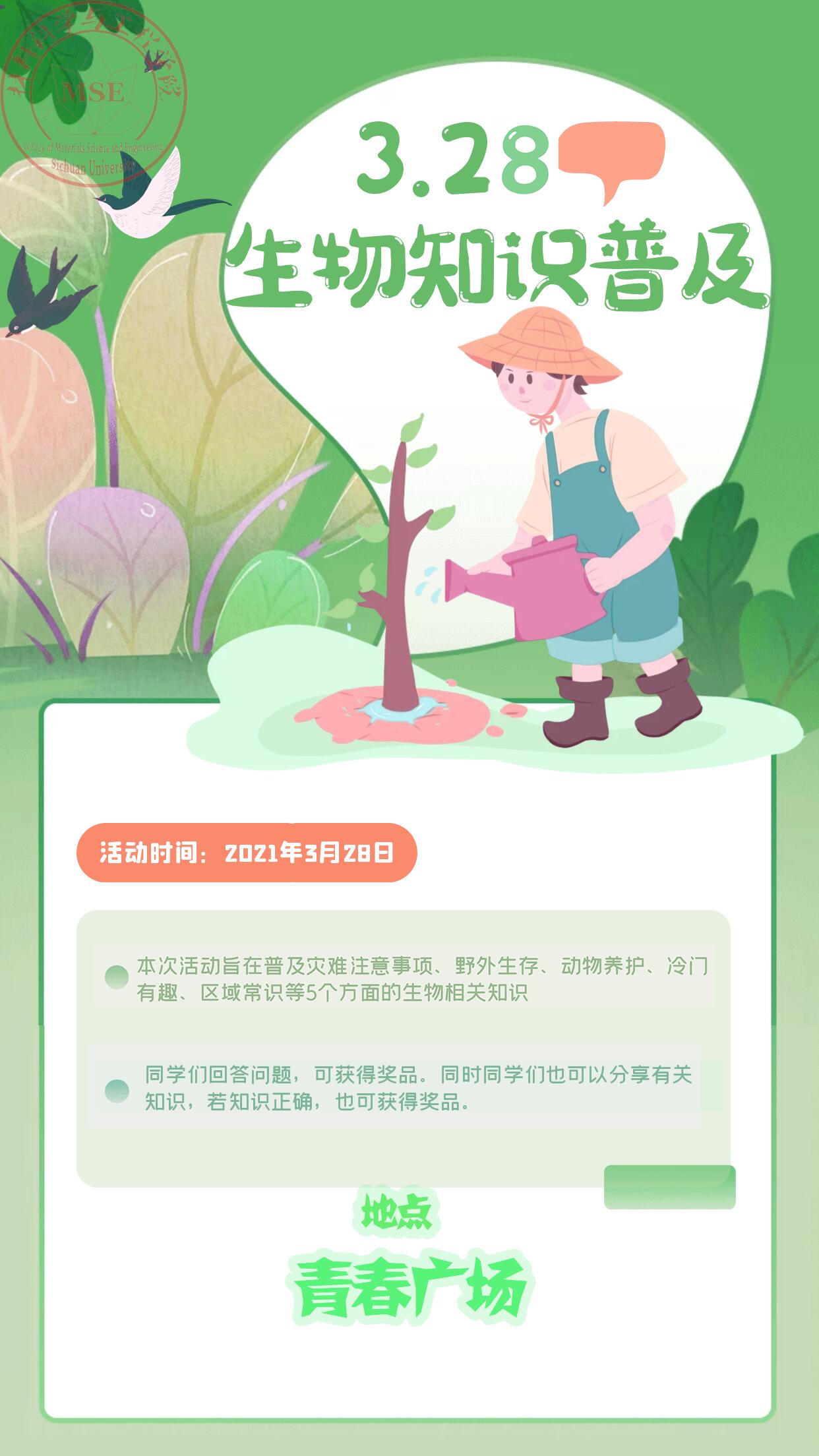 为了普及生物知识,掌握更多的生活常识和应急方法。williamhill中国官方网站“生物知识普及活动”于3月28日在青春广场成功举办。本次活动由学院权益部主办,学院“源泉”青年志愿者协会协办。